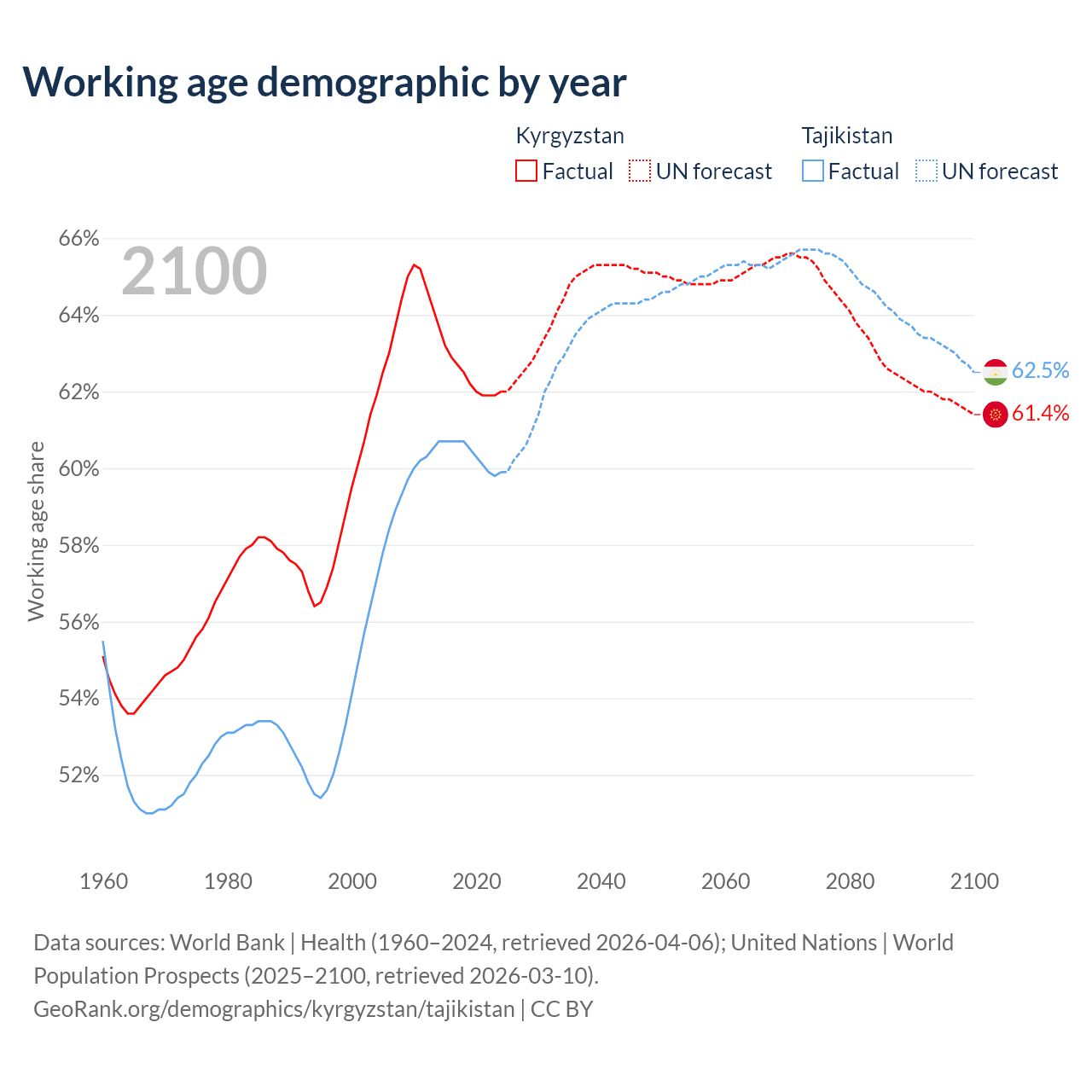 Median age Kyrgyzstan vs Tajikistan, 1960-2100
