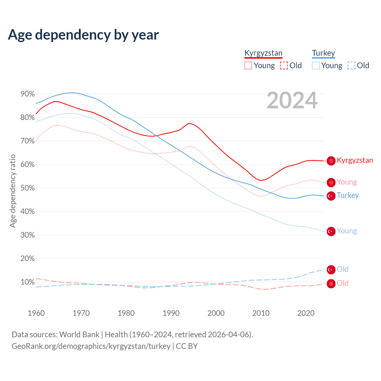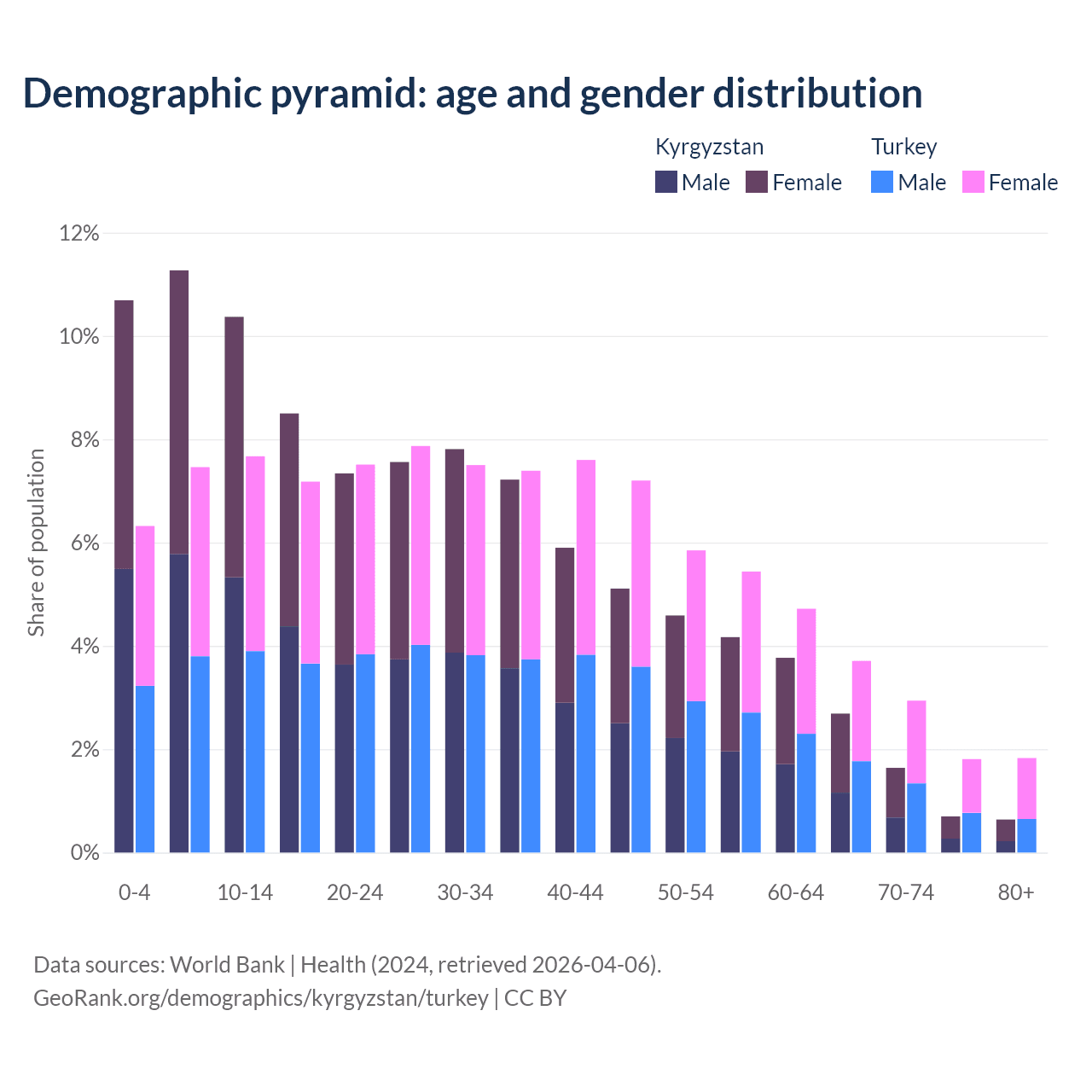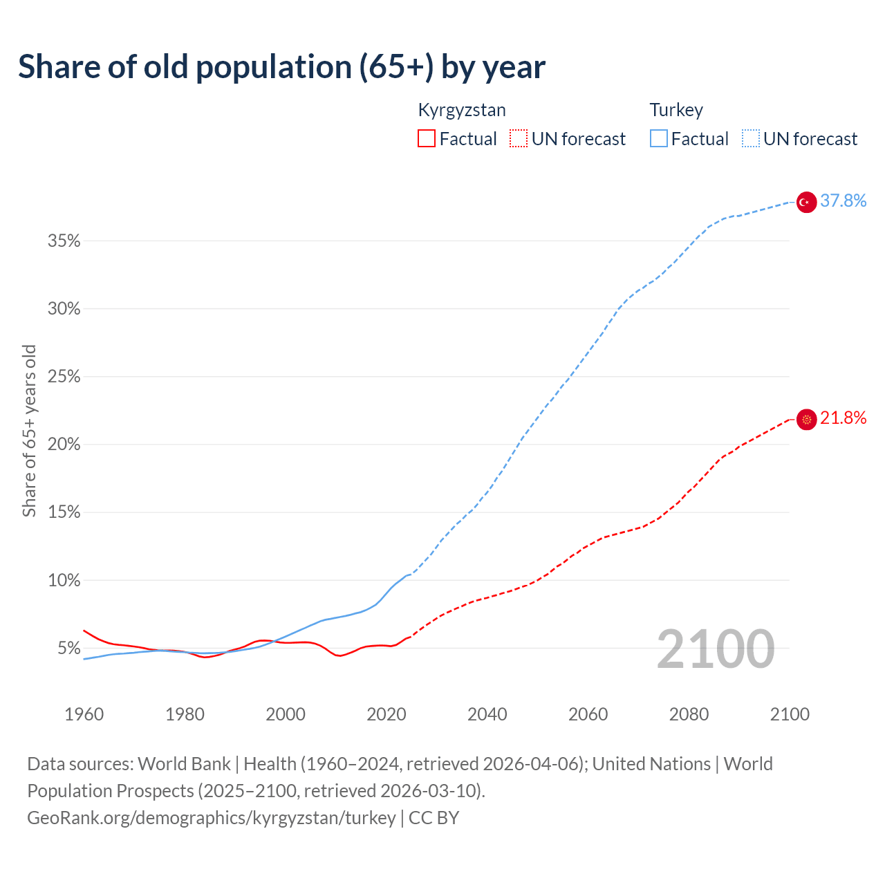 The share of older people aged 65 and over is 5.68% in Kyrgyzstan and 10.3% in Turkey. Life expectancy in Kyrgyzstan compared to Turkey .