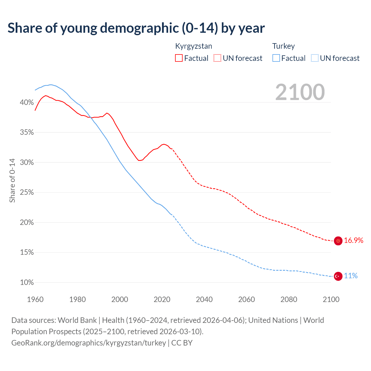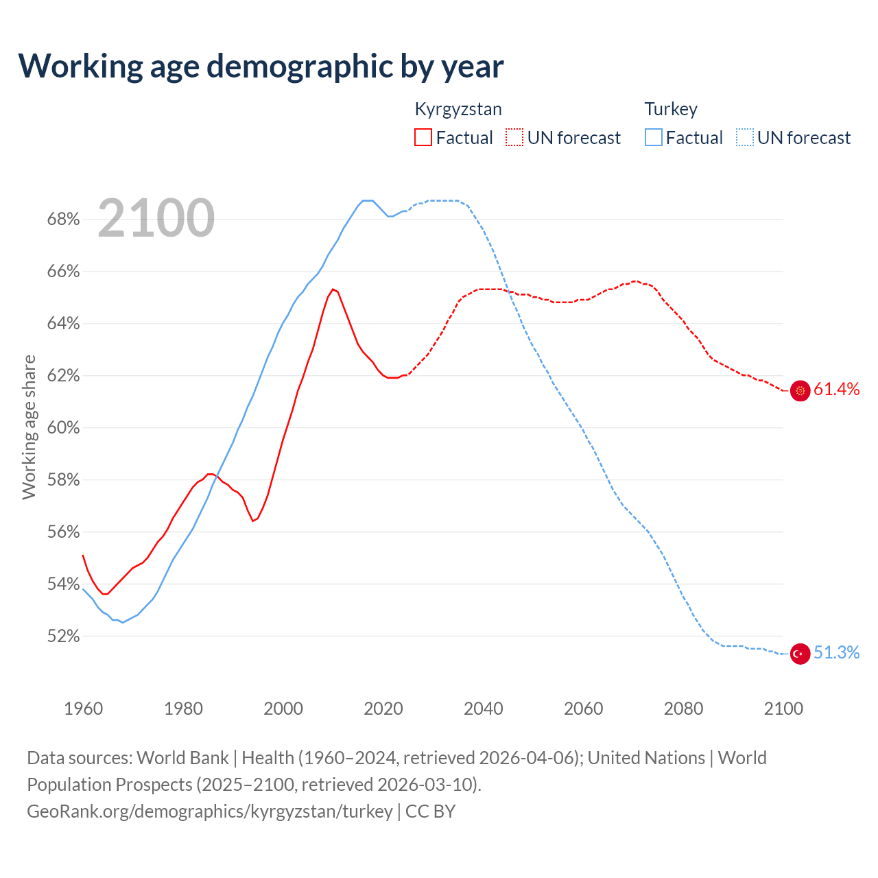 Median age Kyrgyzstan vs Turkey, 1960-2100