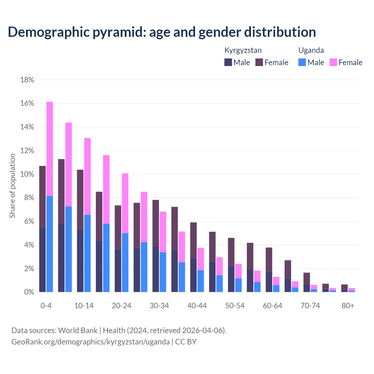 - Kyrgyzstan is ranked 126/196 by median age (oldest to youngest) vs 187/196 for Uganda.