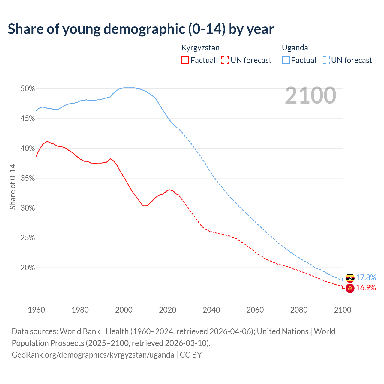 - The share of young demographic (0-15 years old) in Kyrgyzstan is 32.3% vs 43.5% in Uganda.