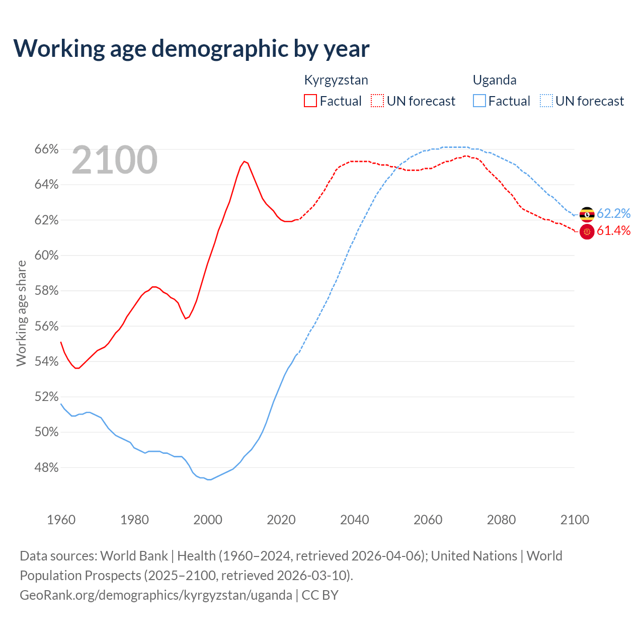 - Kyrgyzstan has 4.63M working age adults (aged 15-64) vs 28.9M in Uganda.