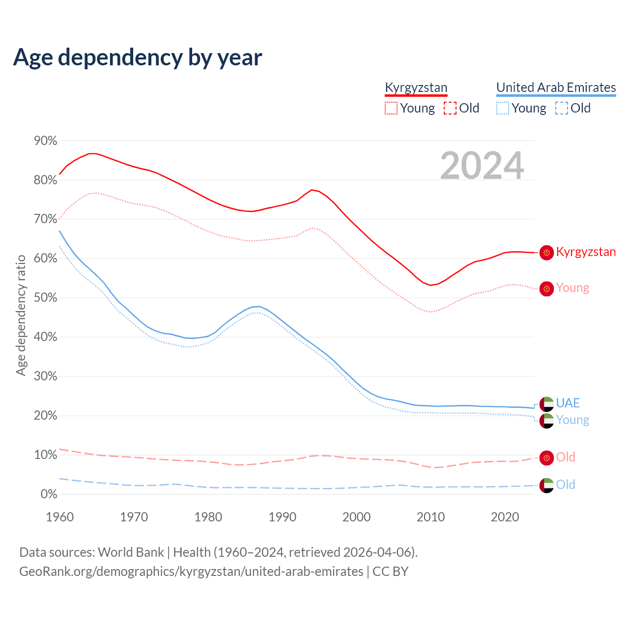 - The share of old-age demographic (65+) in Kyrgyzstan is 5.68% vs 1.77% in the United Arab Emirates.