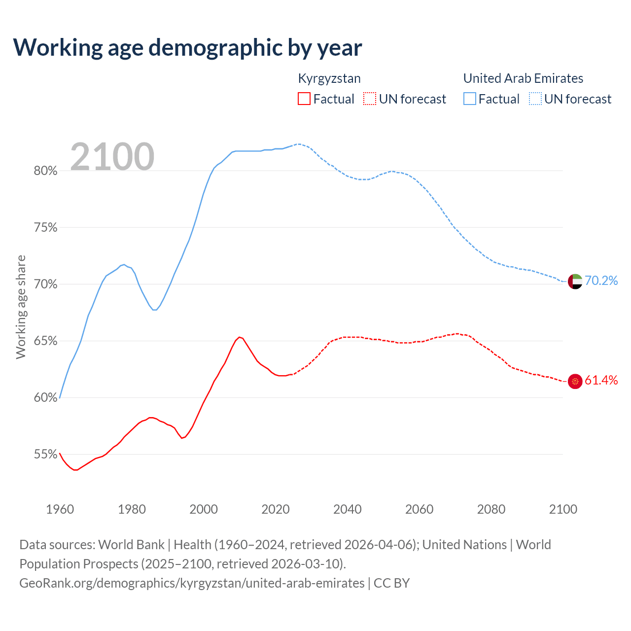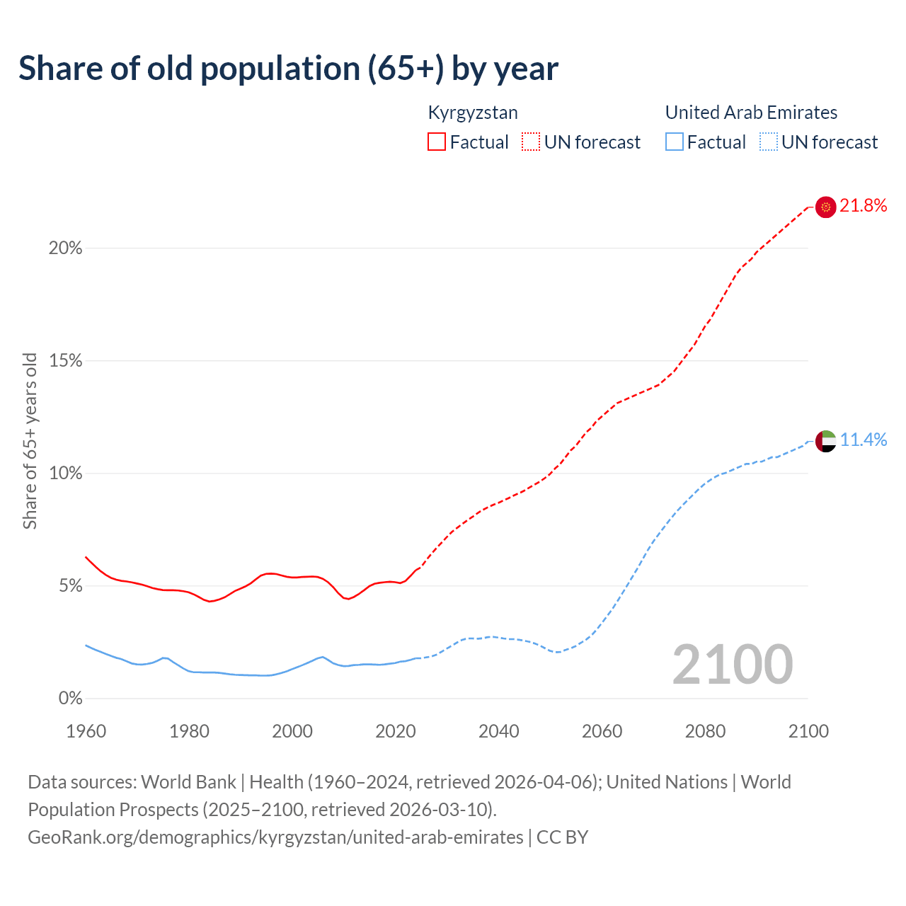 The share of older people aged 65 and over is 5.68% in Kyrgyzstan and 1.77% in the United Arab Emirates. Life expectancy in Kyrgyzstan compared to the United Arab Emirates .