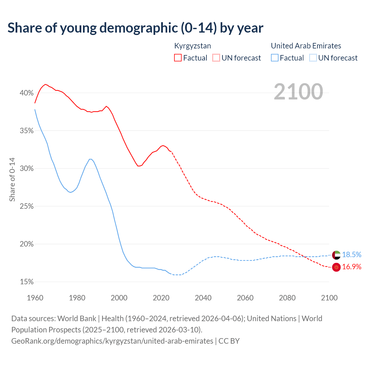- The share of young demographic (0-15 years old) in Kyrgyzstan is 32.3% vs 16.1% in the United Arab Emirates.