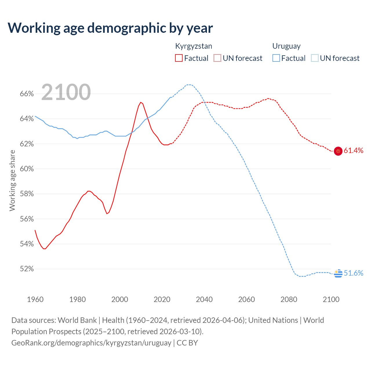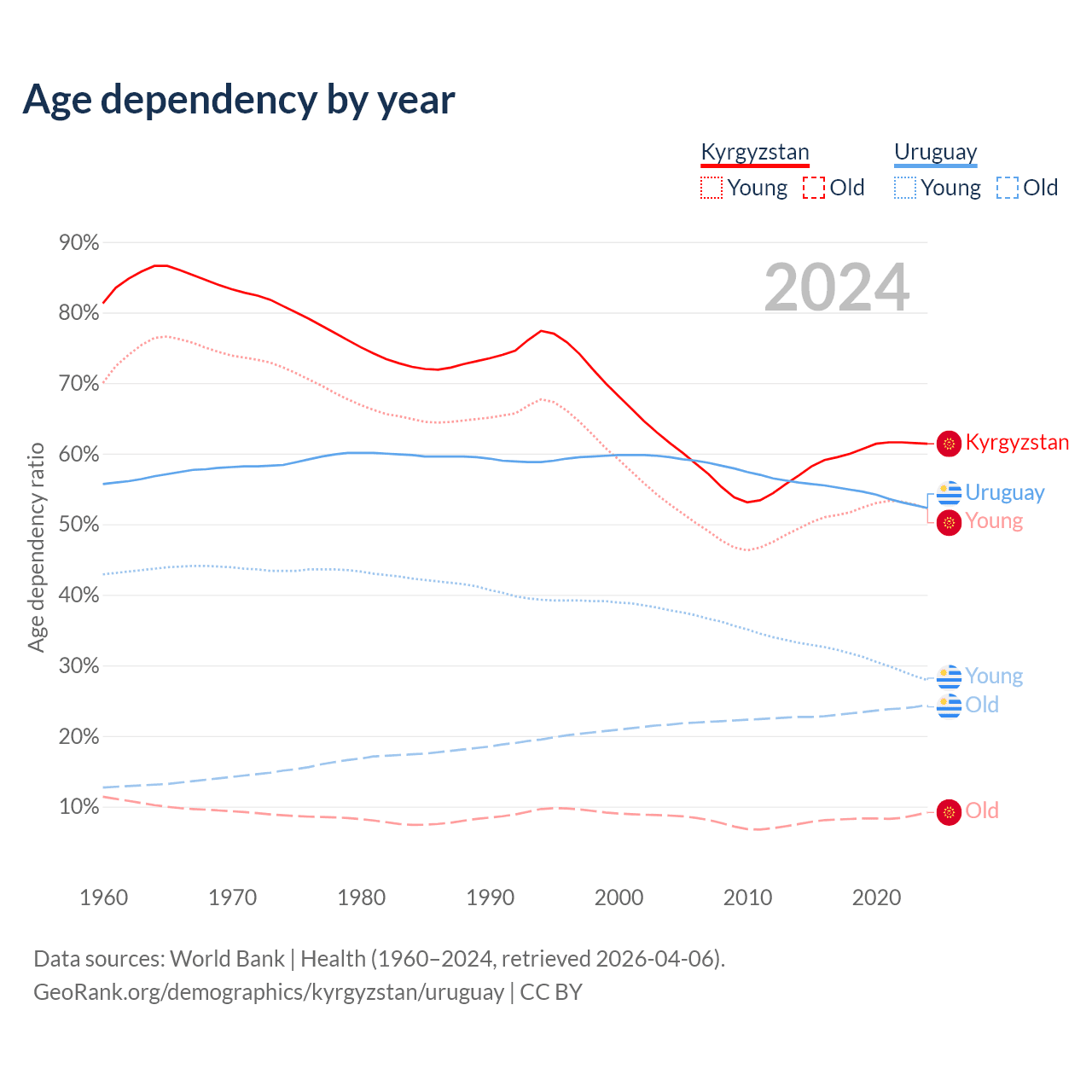 - The share of old-age demographic (65+) in Kyrgyzstan is 5.68% vs 16% in Uruguay.