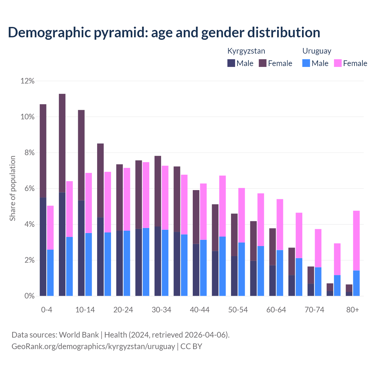 The share of older people aged 65 and over is 5.68% in Kyrgyzstan and 16% in Uruguay. Life expectancy in Kyrgyzstan compared to Uruguay .