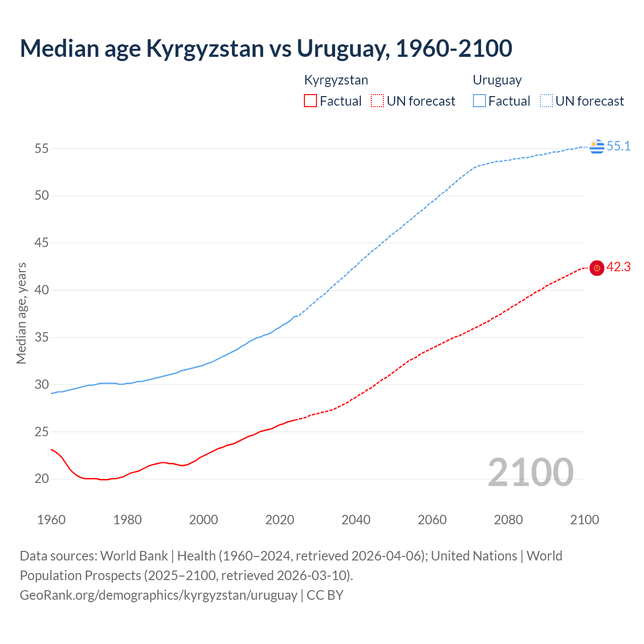 Median age Kyrgyzstan vs Uruguay, 1960-2100