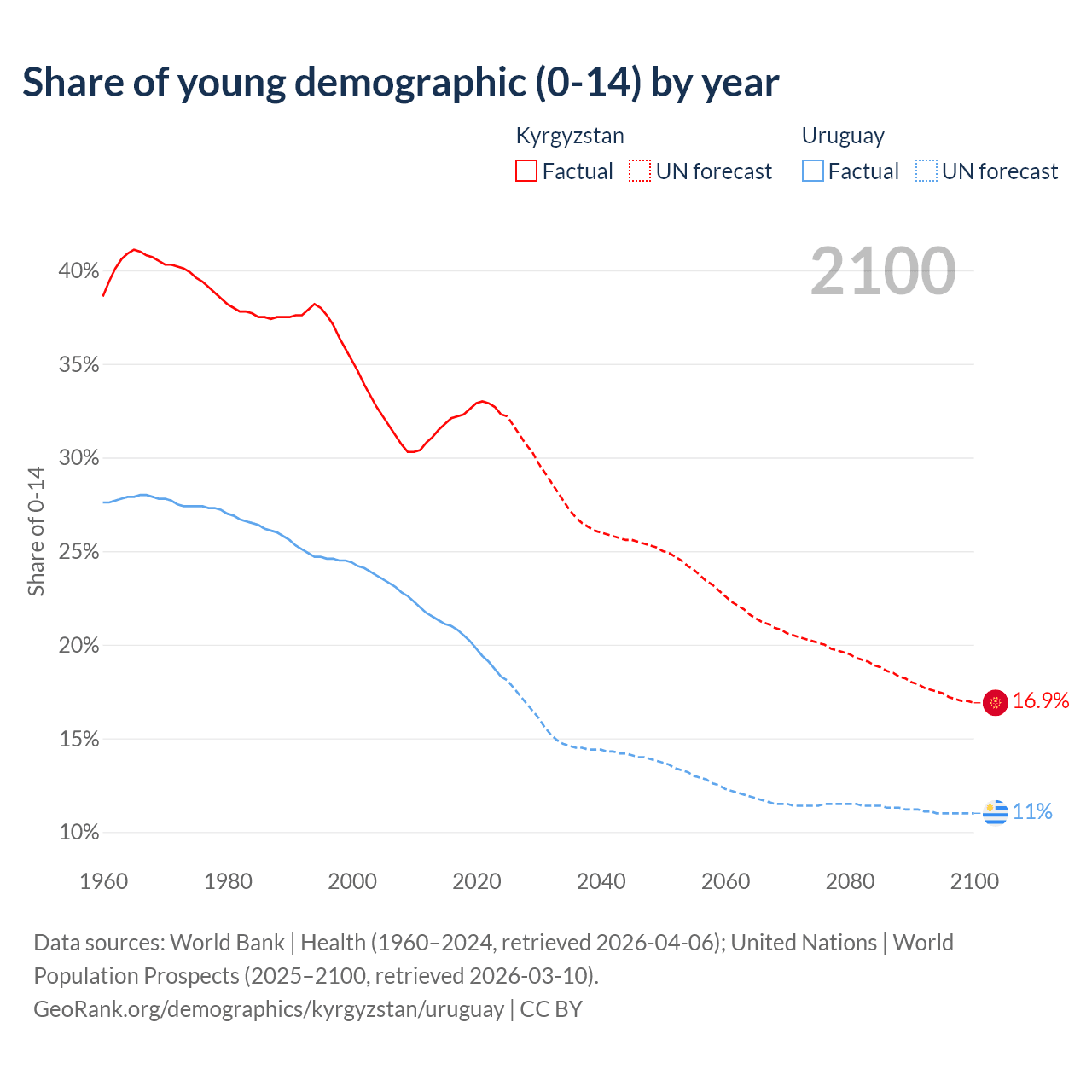 - The share of young demographic (0-15 years old) in Kyrgyzstan is 32.3% vs 18.3% in Uruguay.