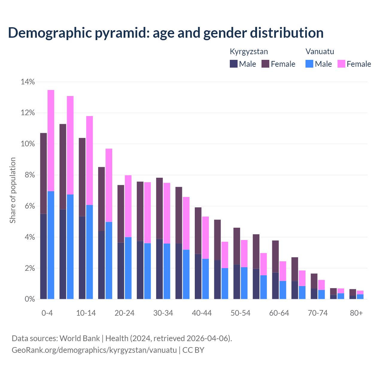 - The share of young demographic (0-15 years old) in Kyrgyzstan is 32.3% vs 38.3% in Vanuatu.