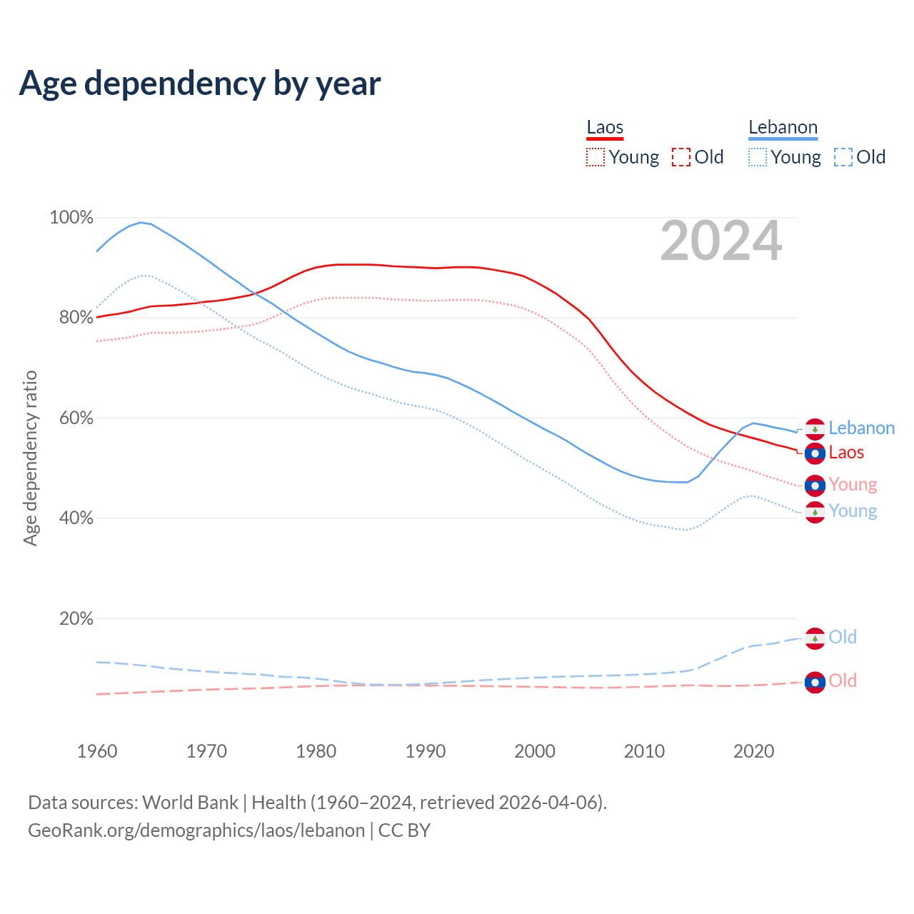 - Laos is ranked 130/196 by median age (oldest to youngest) vs 106/196 for Lebanon.