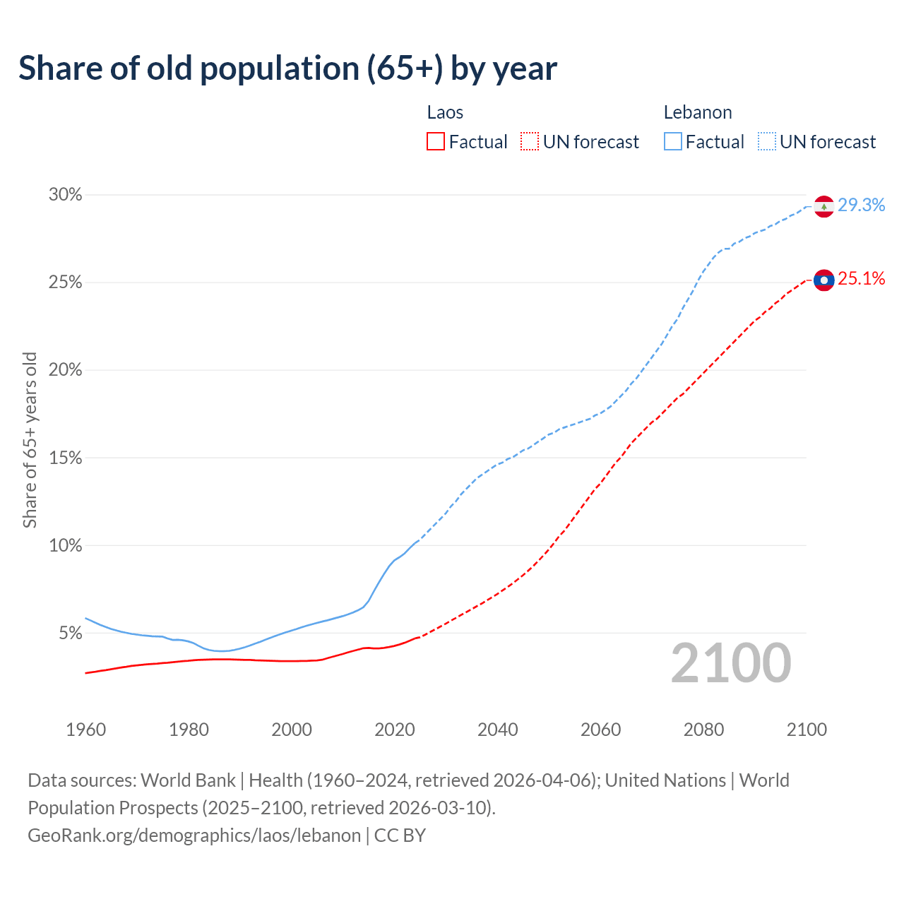The share of older people aged 65 and over is 4.67% in Laos and 10.1% in Lebanon. Life expectancy in Laos compared to Lebanon .