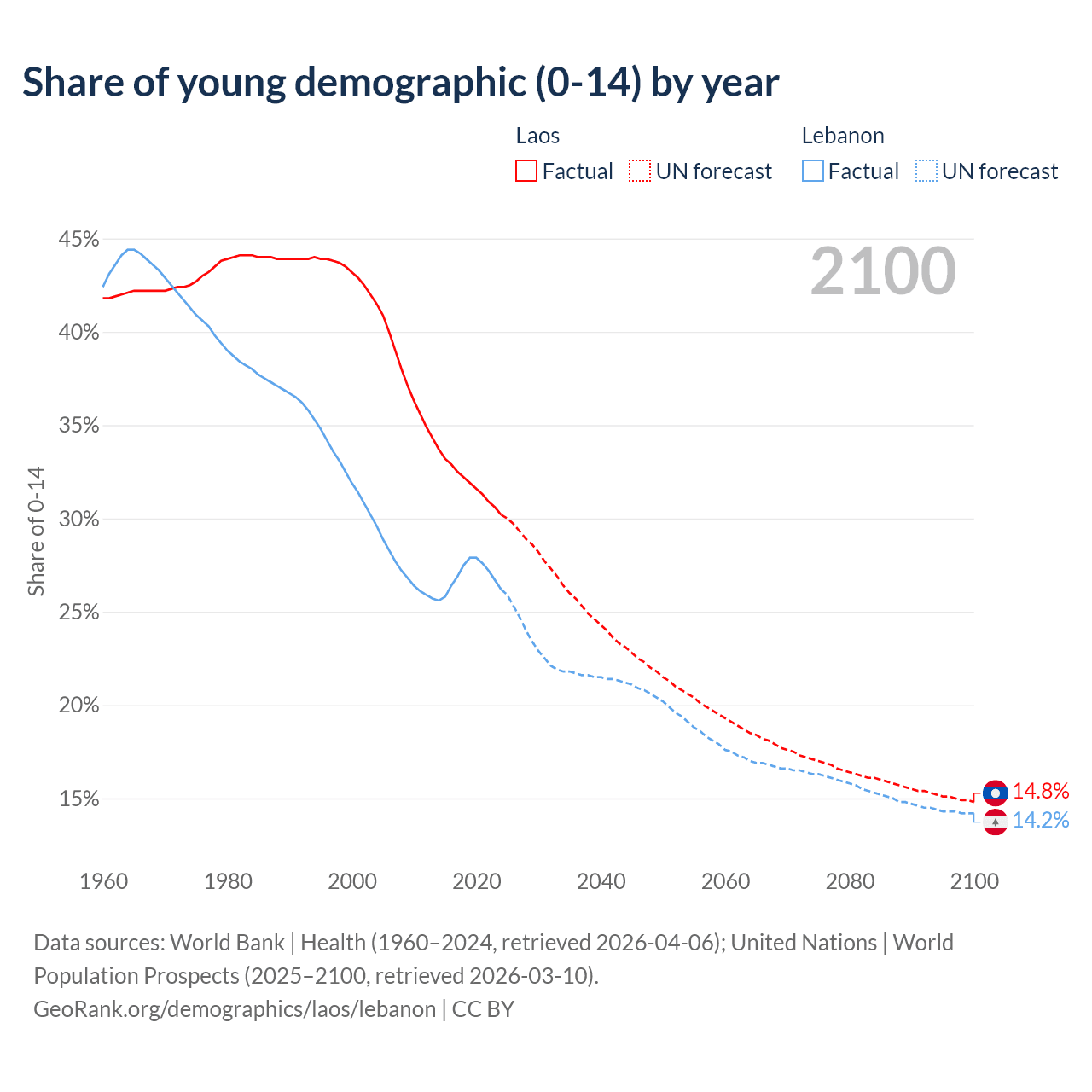 - The share of young demographic (0-15 years old) in Laos is 30.2% vs 26.2% in Lebanon.