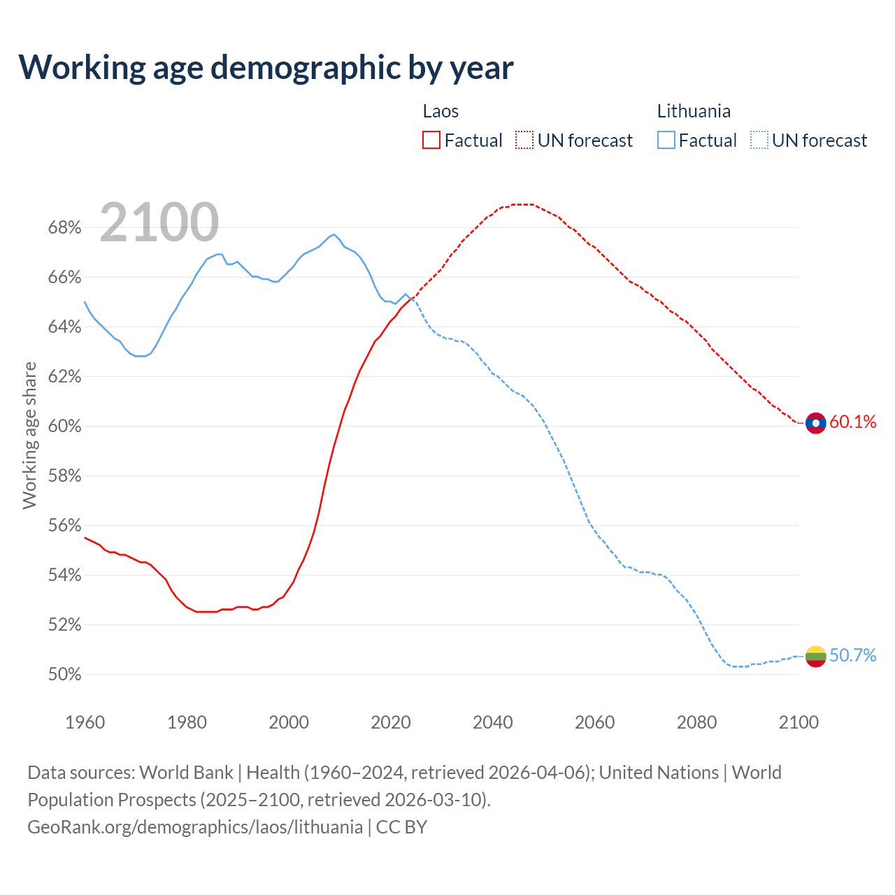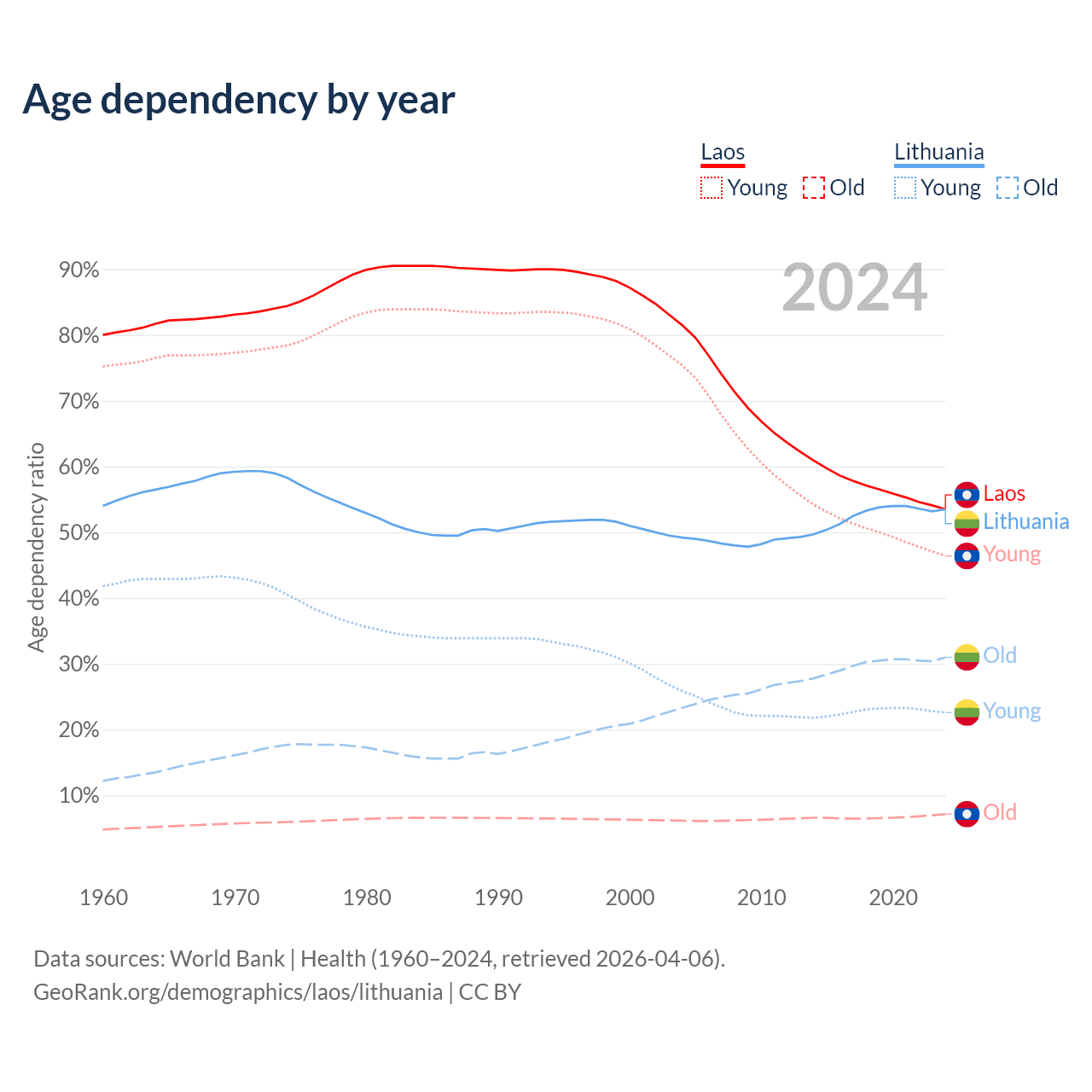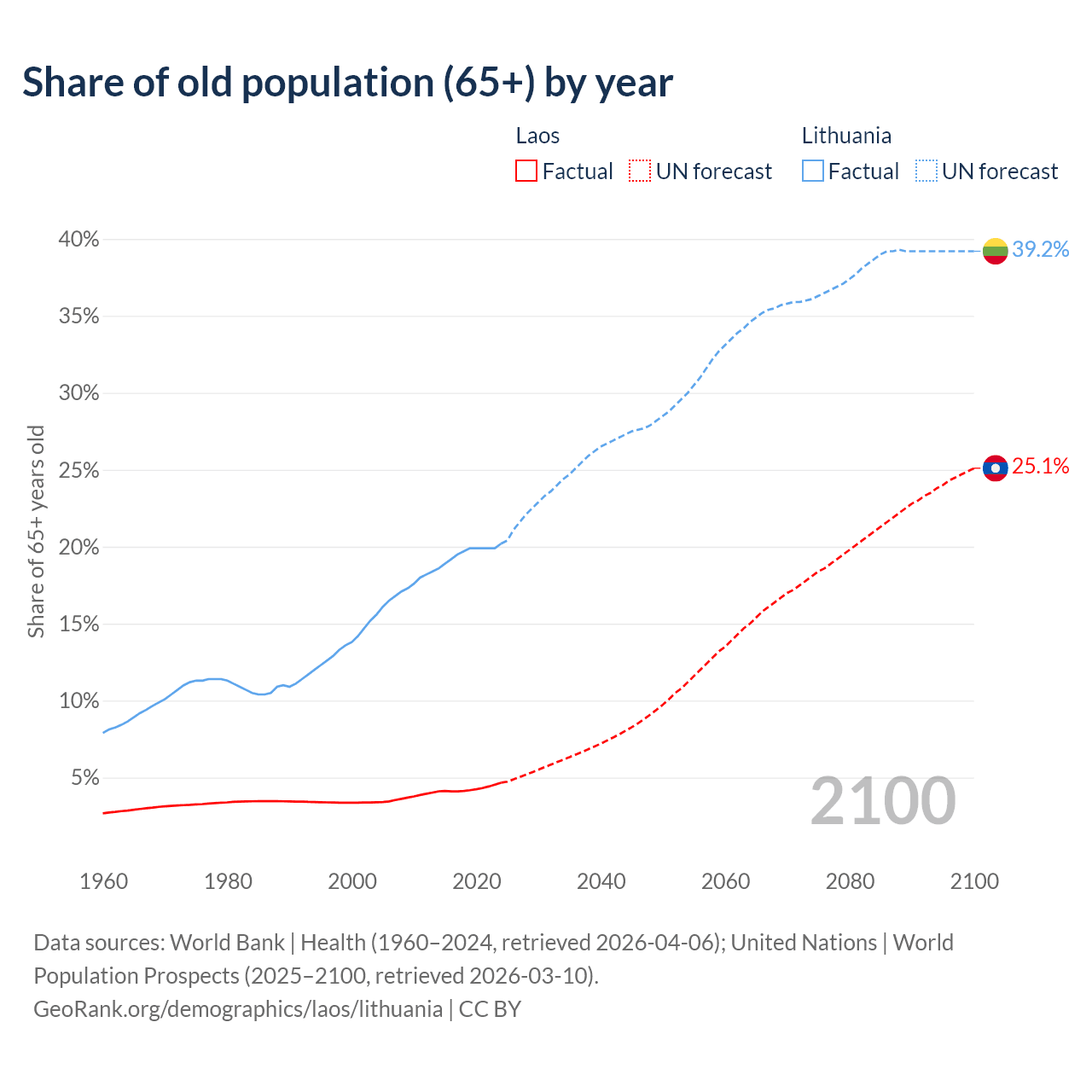 - The share of old-age demographic (65+) in Laos is 4.67% vs 20.2% in Lithuania.