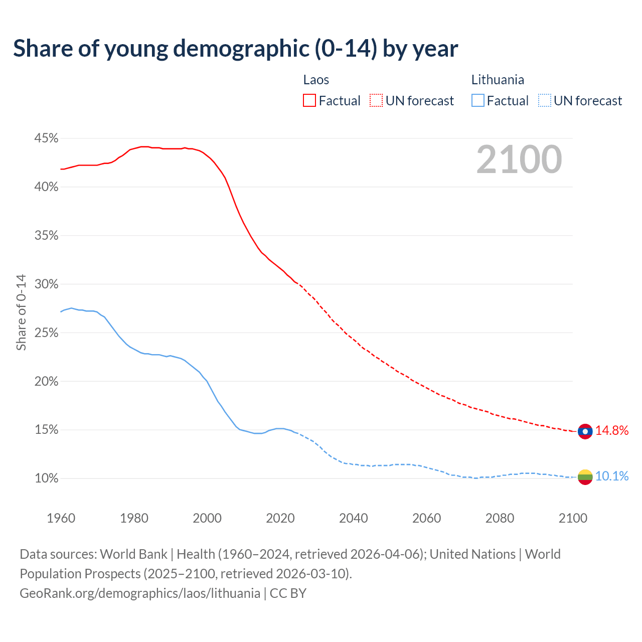 - The share of young demographic (0-15 years old) in Laos is 30.2% vs 14.7% in Lithuania.