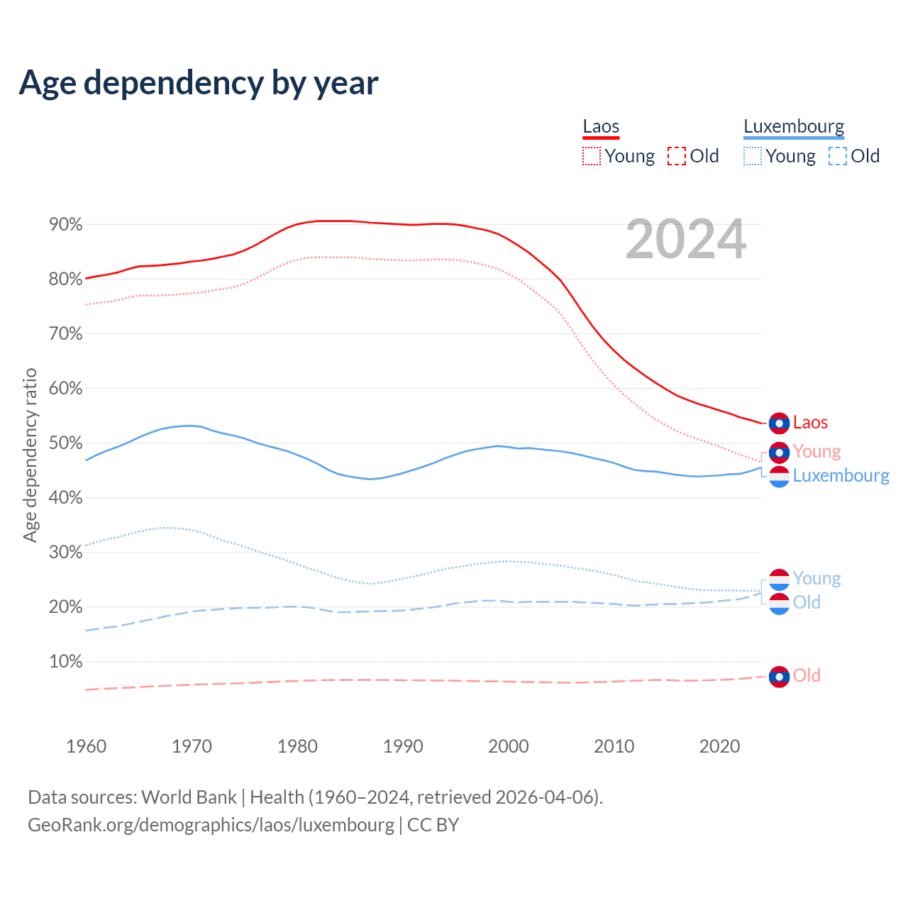 - Laos is ranked 130/196 by median age (oldest to youngest) vs 46/196 for Luxembourg.