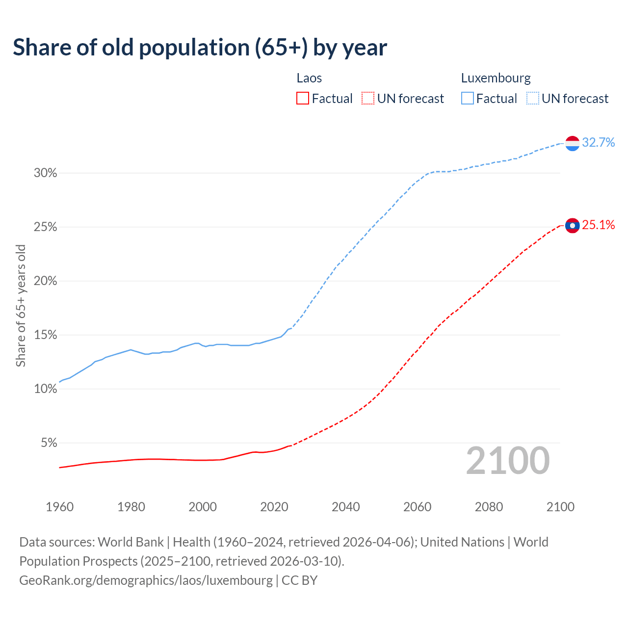 - The share of old-age demographic (65+) in Laos is 4.67% vs 15.5% in Luxembourg.