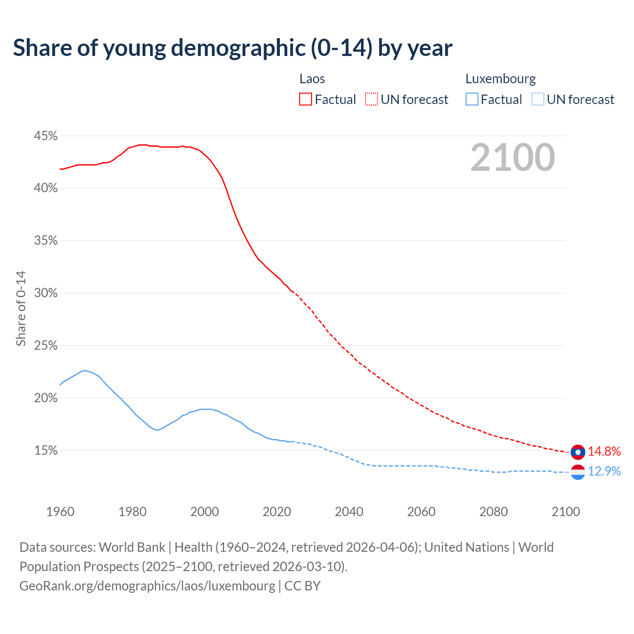 - The share of young demographic (0-15 years old) in Laos is 30.2% vs 15.8% in Luxembourg.