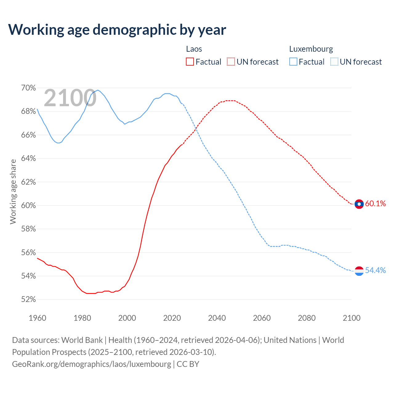 - Laos has 5.21M working age adults (aged 15-64) vs 477K in Luxembourg.