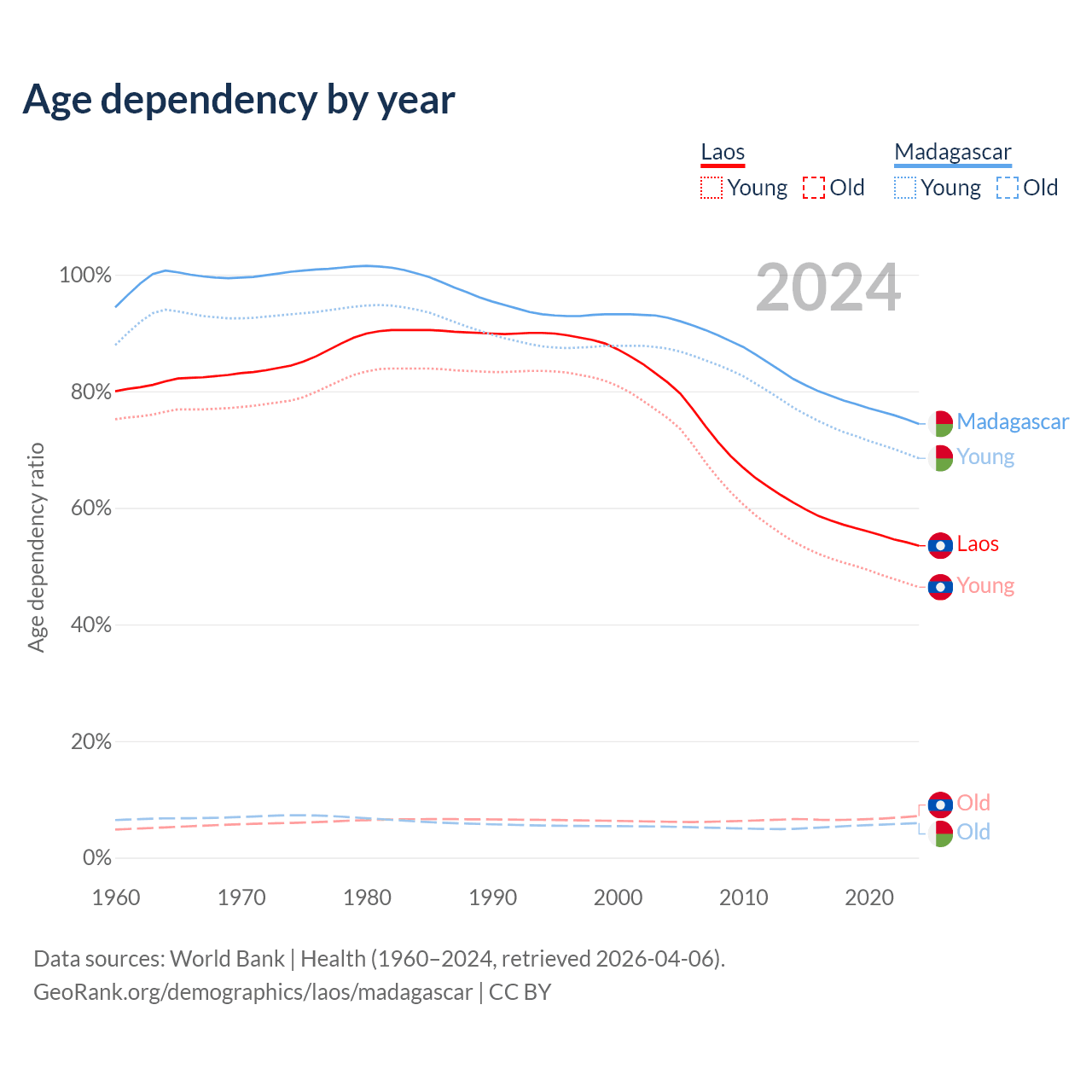- Laos is ranked 130/196 by median age (oldest to youngest) vs 165/196 for Madagascar.