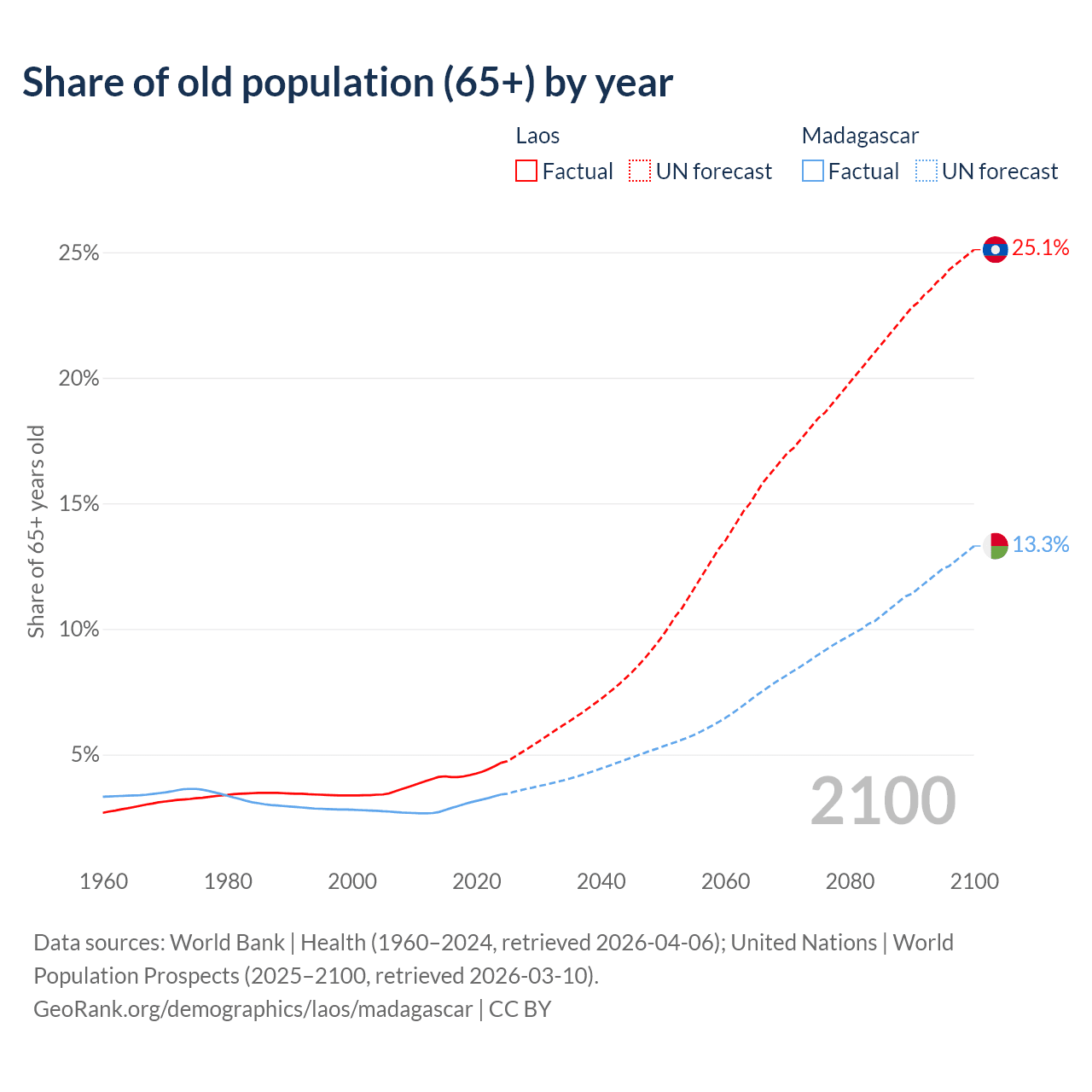- The share of old-age demographic (65+) in Laos is 4.67% vs 3.41% in Madagascar.
