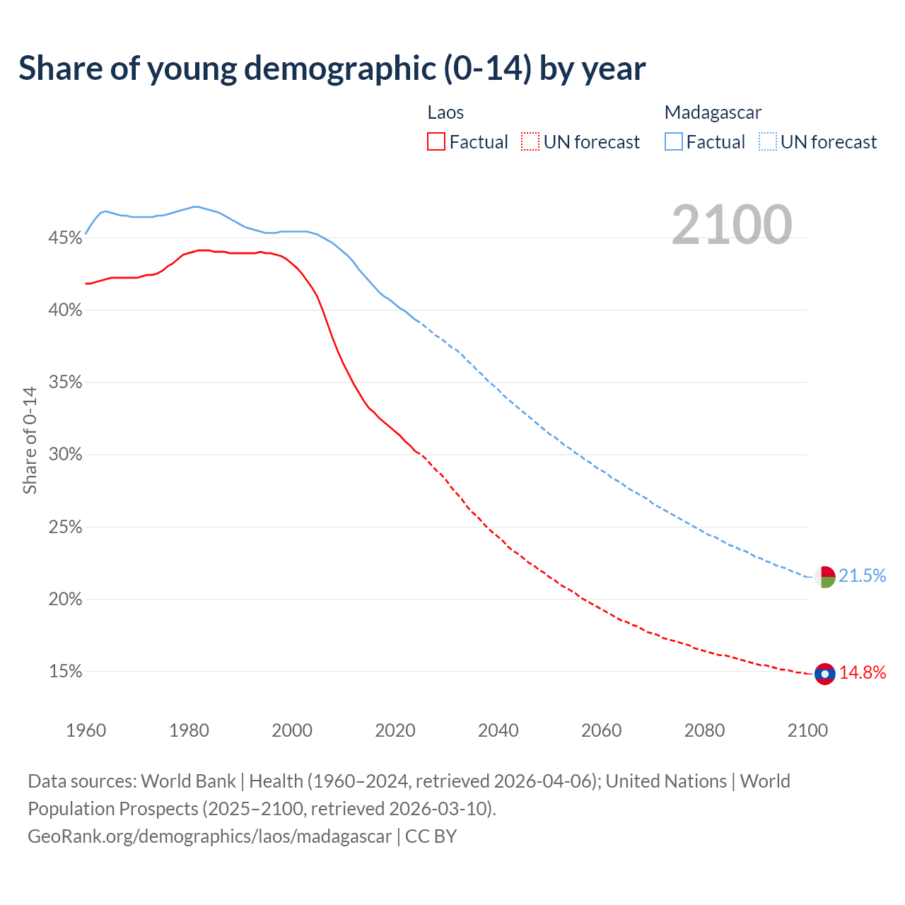 - As of 2026, the population of Laos is 8M vs 33.8M in Madagascar - 4.22 times difference.