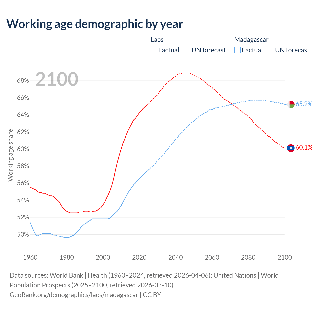 - Laos has 5.21M working age adults (aged 15-64) vs 19.4M in Madagascar.