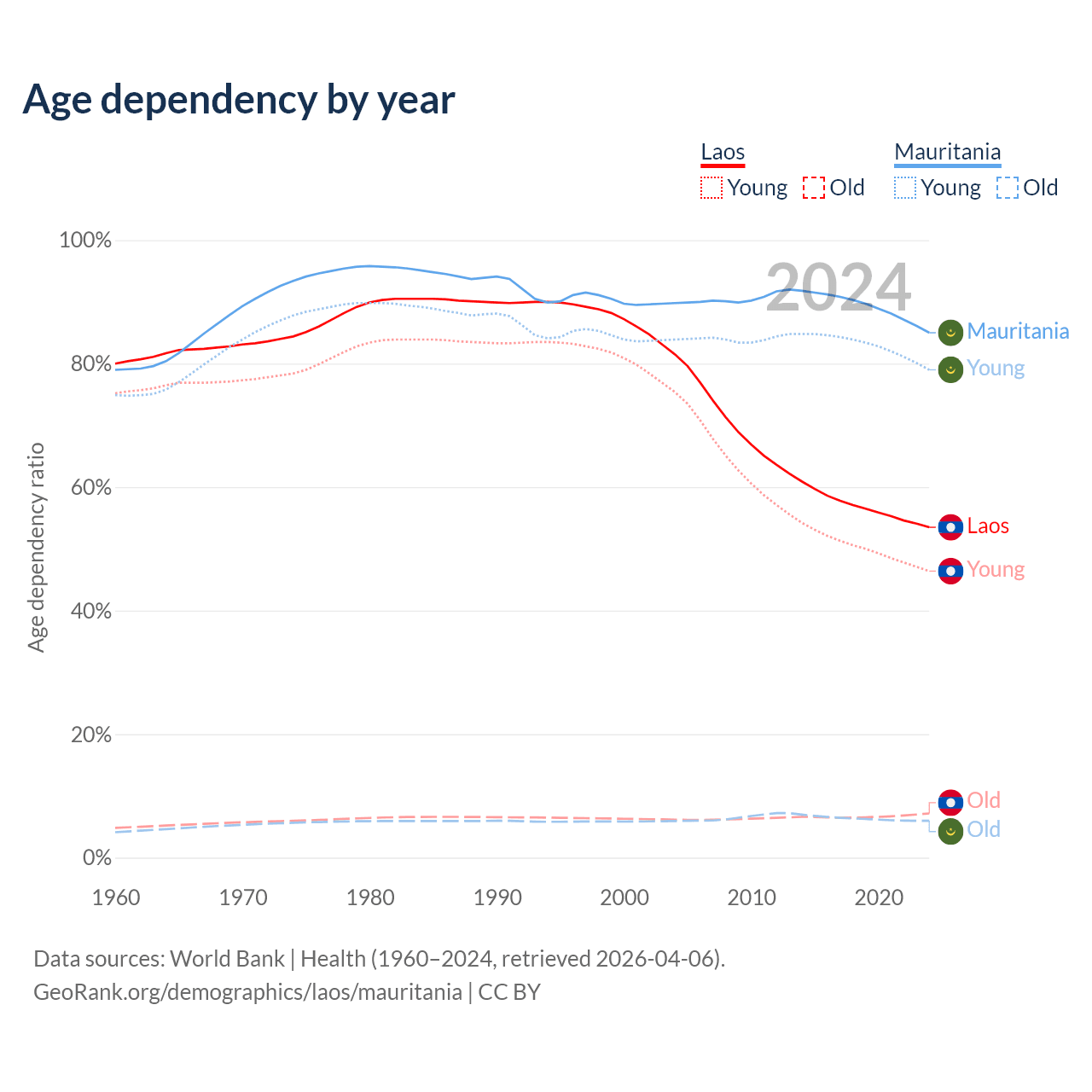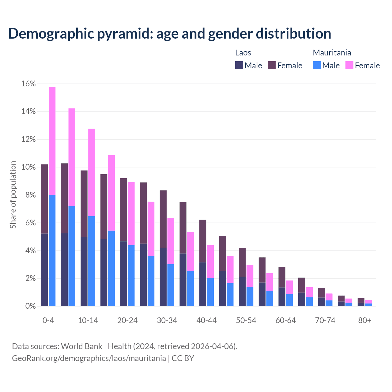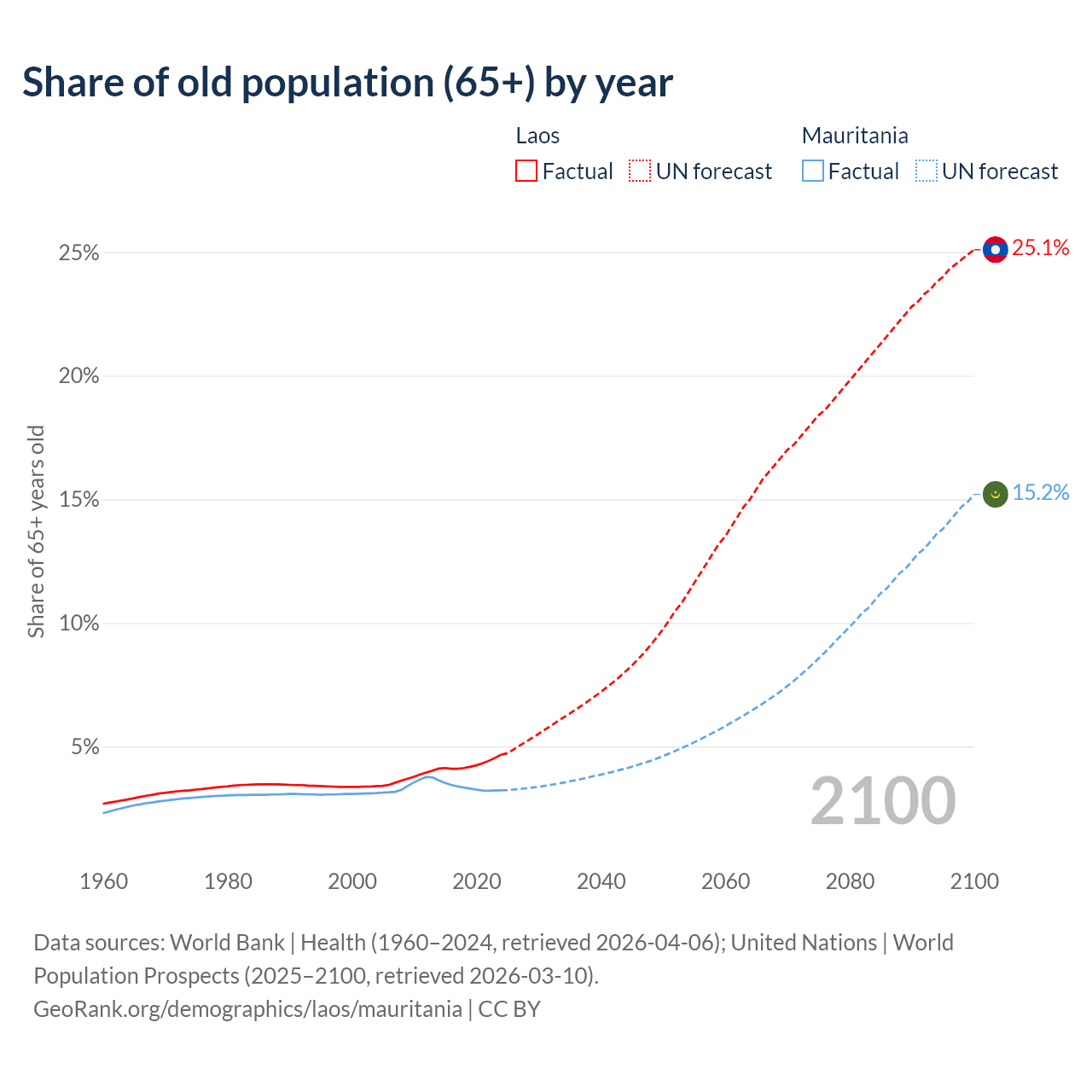 - The share of old-age demographic (65+) in Laos is 4.67% vs 3.23% in Mauritania.