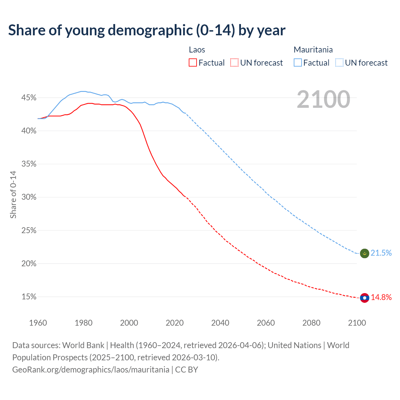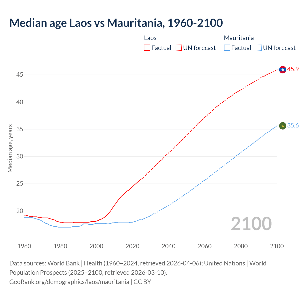 Median age Laos vs Mauritania, 1960-2100