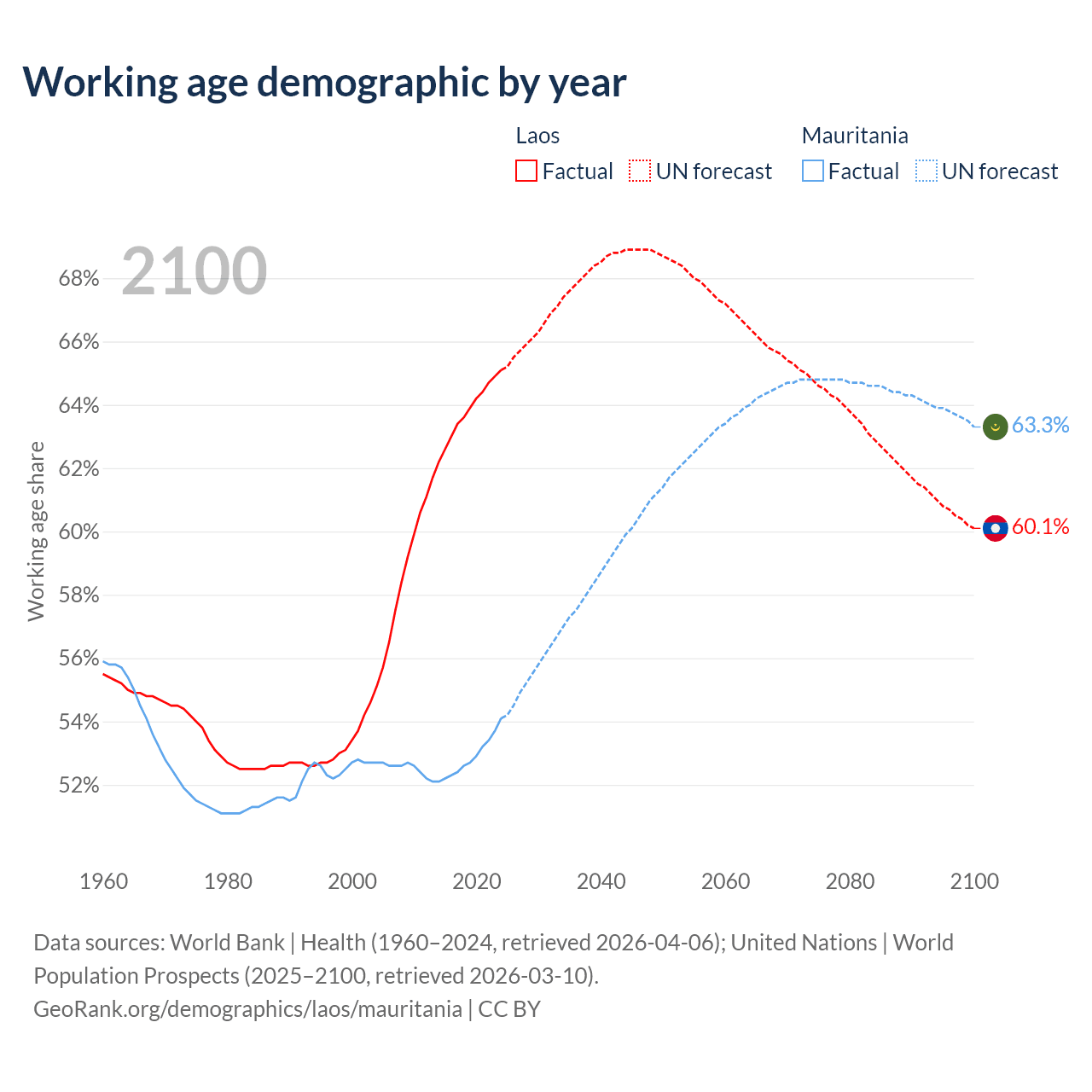 - Laos has 5.21M working age adults (aged 15-64) vs 2.98M in Mauritania.