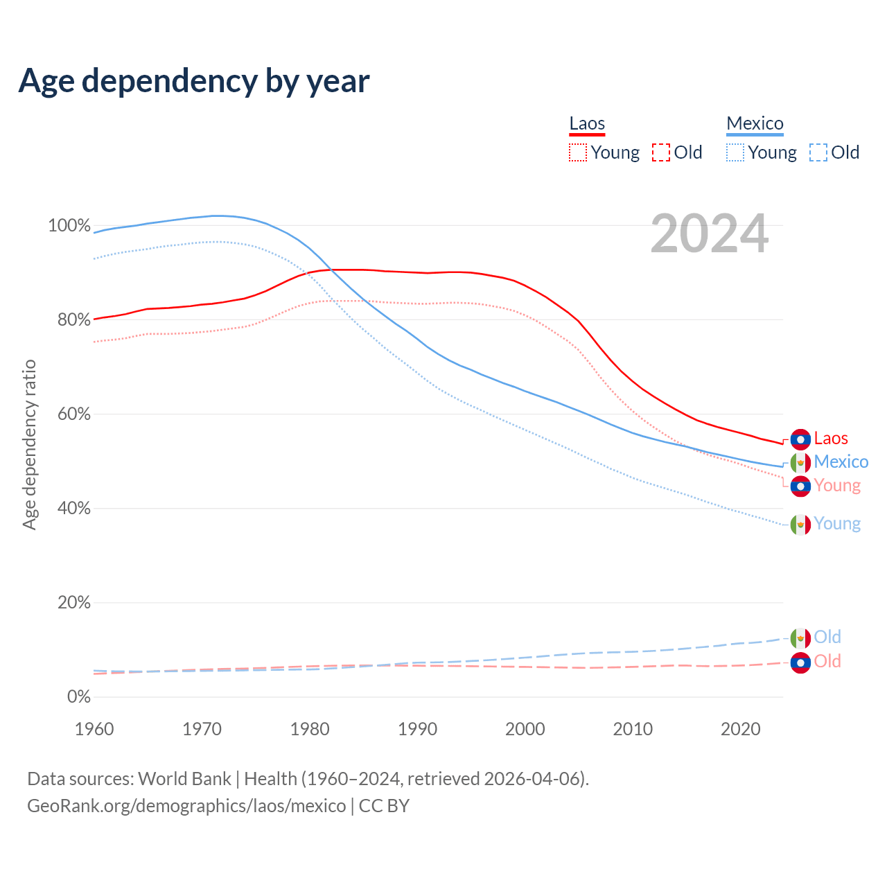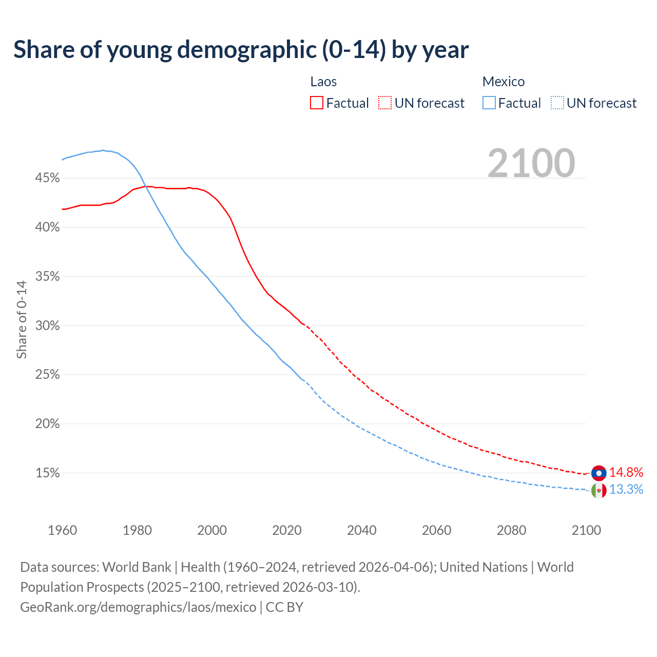 - Laos is ranked 130/196 by median age (oldest to youngest) vs 102/196 for Mexico.
