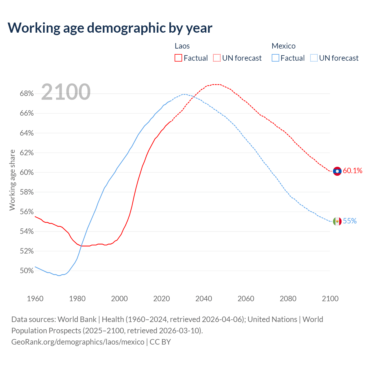 - Laos has 5.21M working age adults (aged 15-64) vs 89.6M in Mexico.