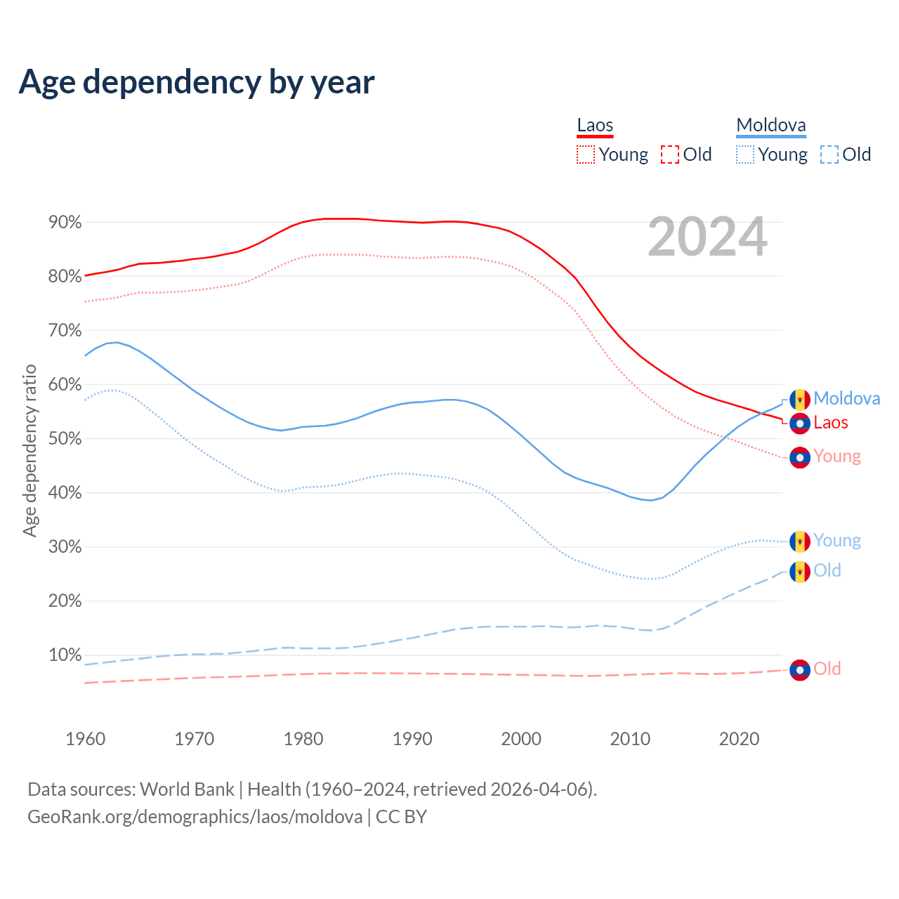 - Laos is ranked 130/196 by median age (oldest to youngest) vs 54/196 for Moldova.