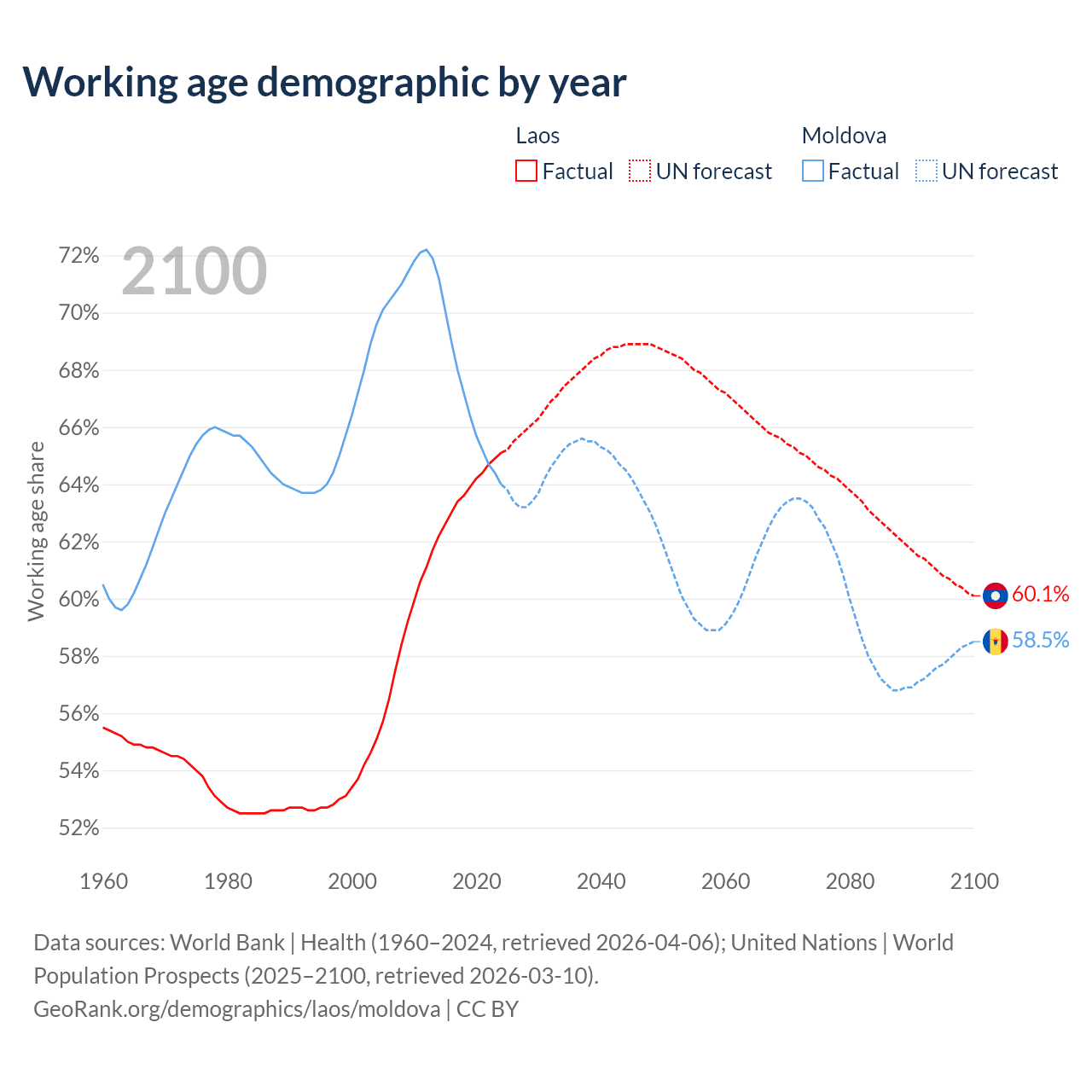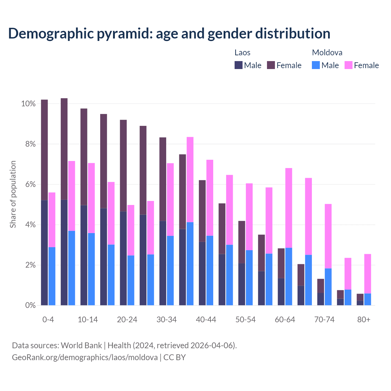 - As of 2026, the population of Laos is 8M vs 2.34M in Moldova - 3.42 times difference.
