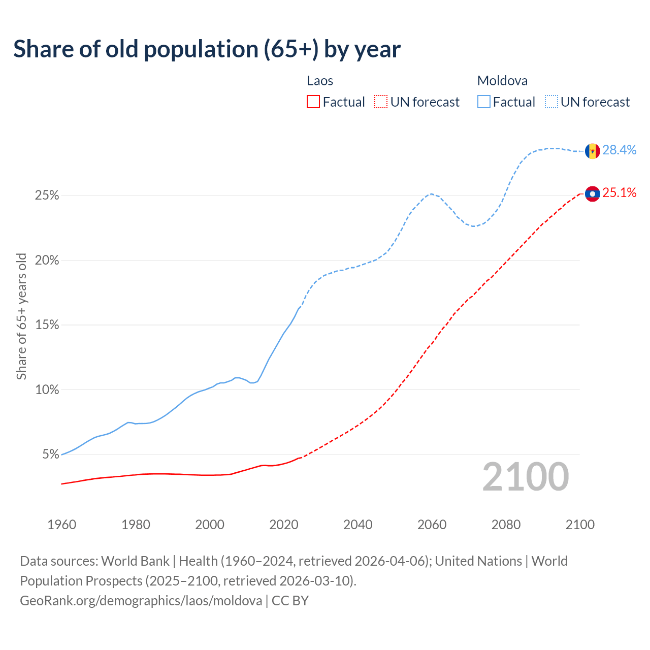 - The share of old-age demographic (65+) in Laos is 4.67% vs 16.2% in Moldova.