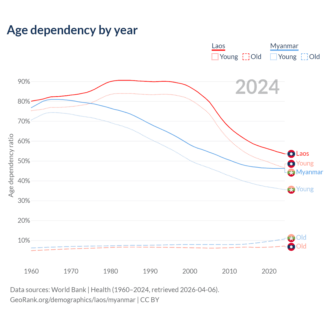Data sources: World Bank | Health (1960–2024, retrieved 2026-04-06); U.S. Census Bureau (1960–2024, retrieved 2026-02-08).