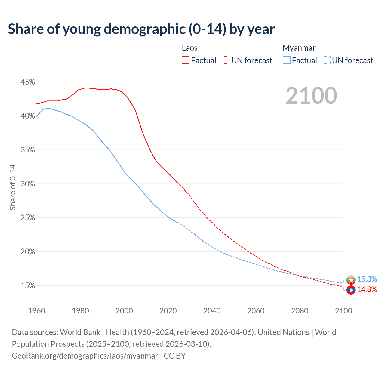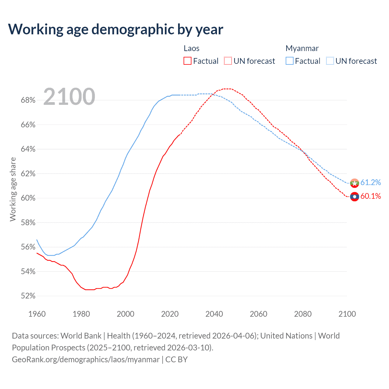 Median age Laos vs Myanmar, 1960-2100