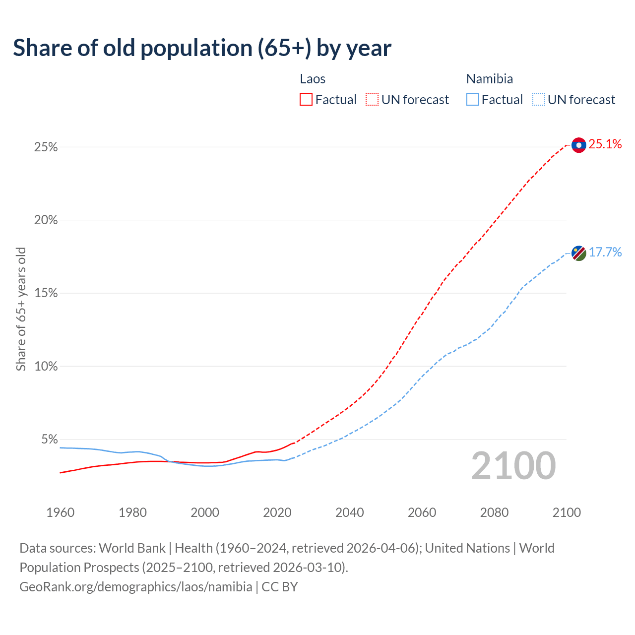 - The share of old-age demographic (65+) in Laos is 4.67% vs 3.67% in Namibia.