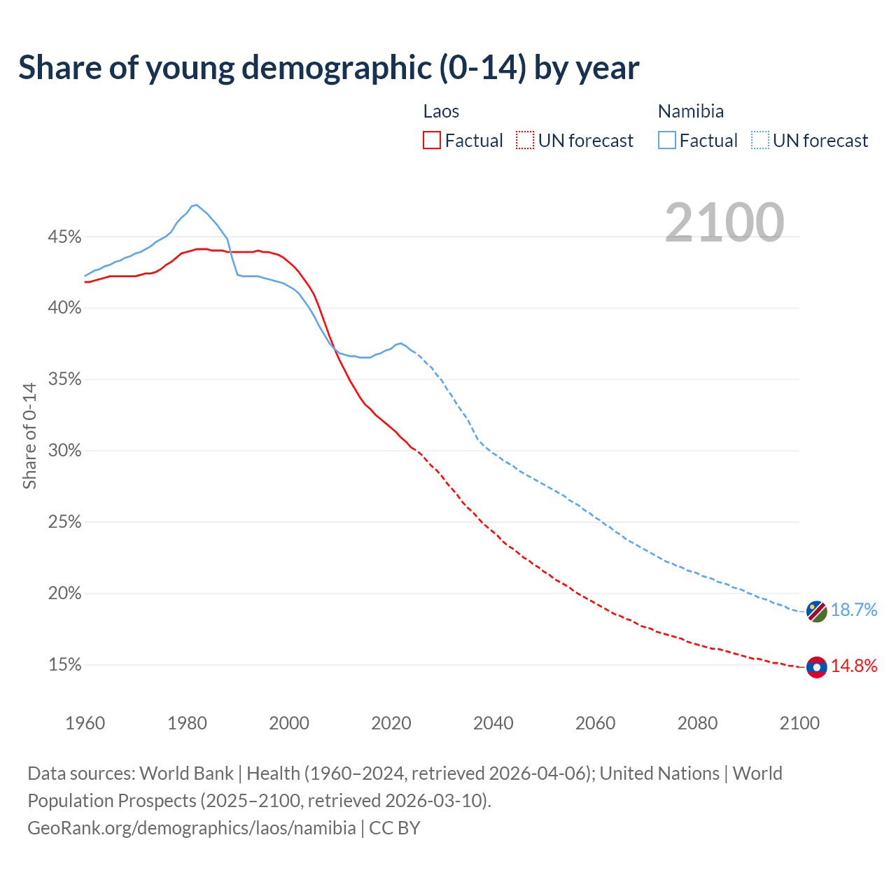 - Laos is ranked 130/196 by median age (oldest to youngest) vs 147/196 for Namibia.