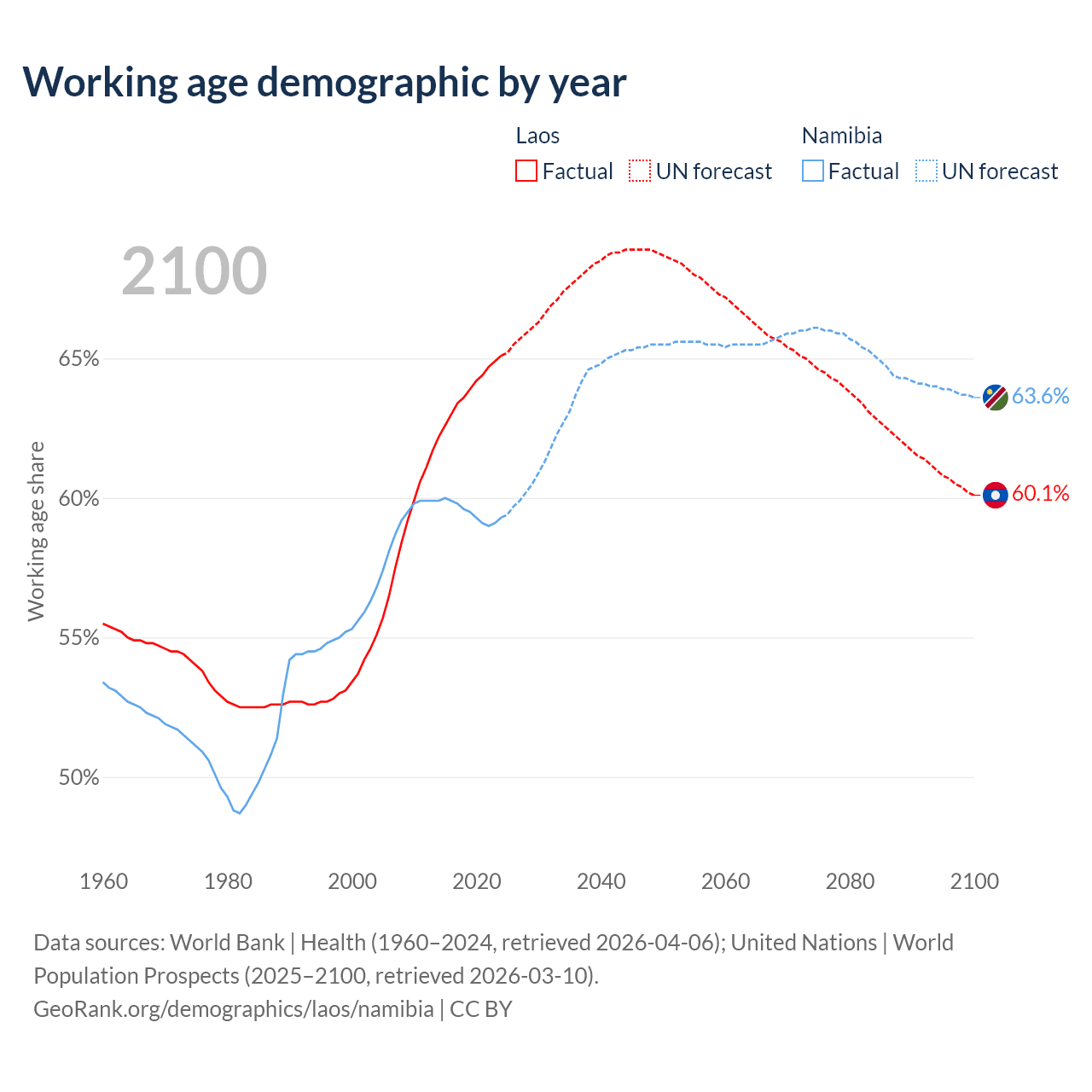 - Laos has 5.21M working age adults (aged 15-64) vs 1.88M in Namibia.