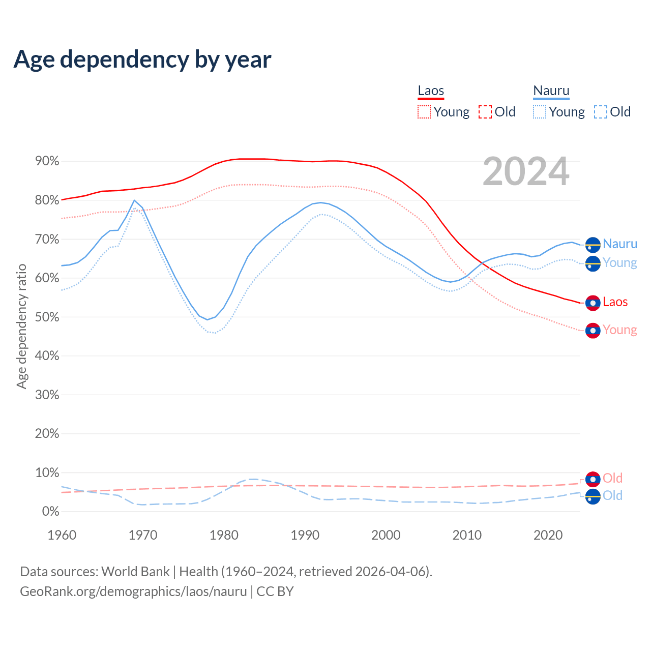 Data sources: World Bank | Health (1960–2024, retrieved 2026-04-06); U.S. Census Bureau (1960–2024, retrieved 2026-02-08).