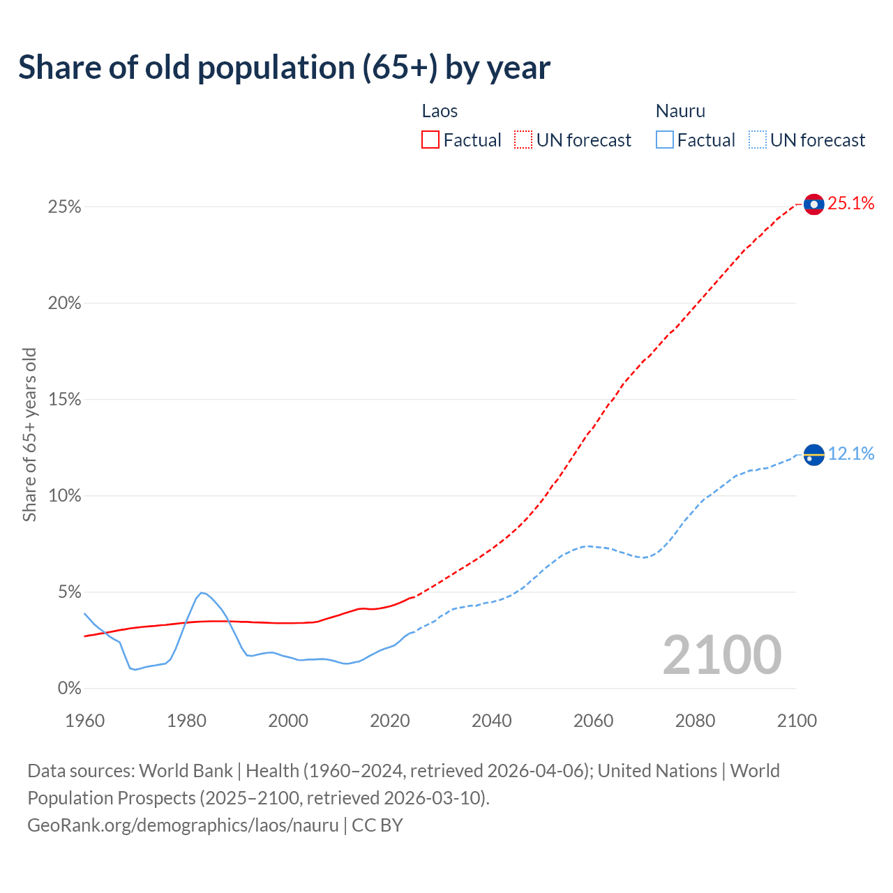 The share of older people aged 65 and over is 4.67% in Laos and 2.85% in Nauru. Life expectancy in Laos compared to Nauru .