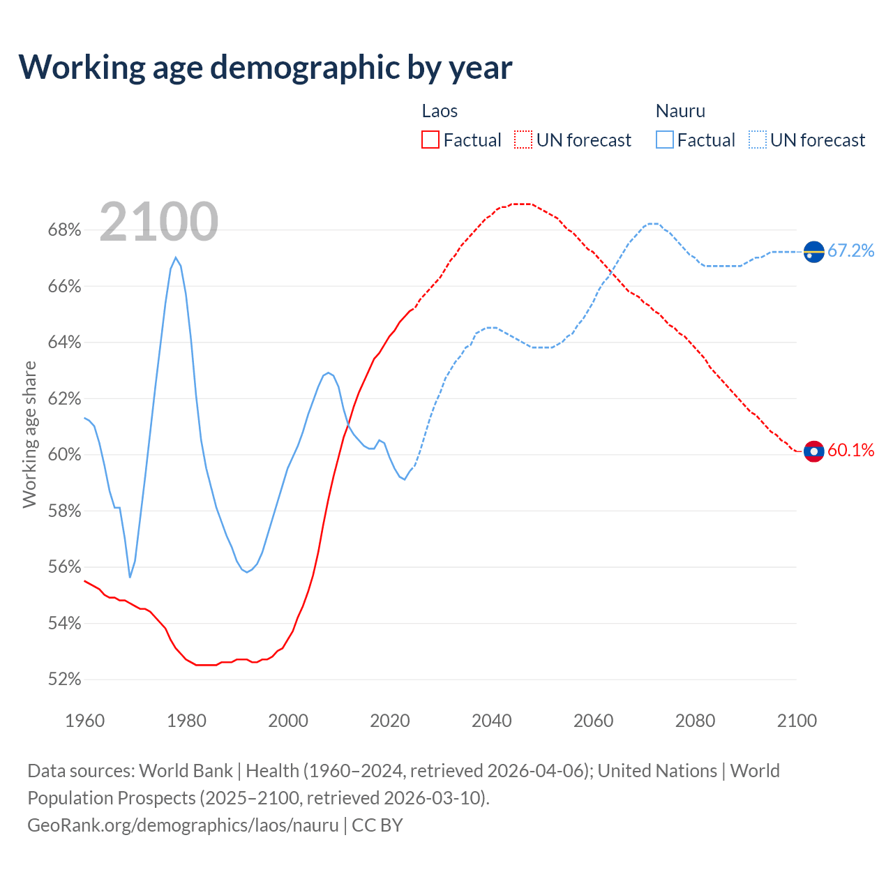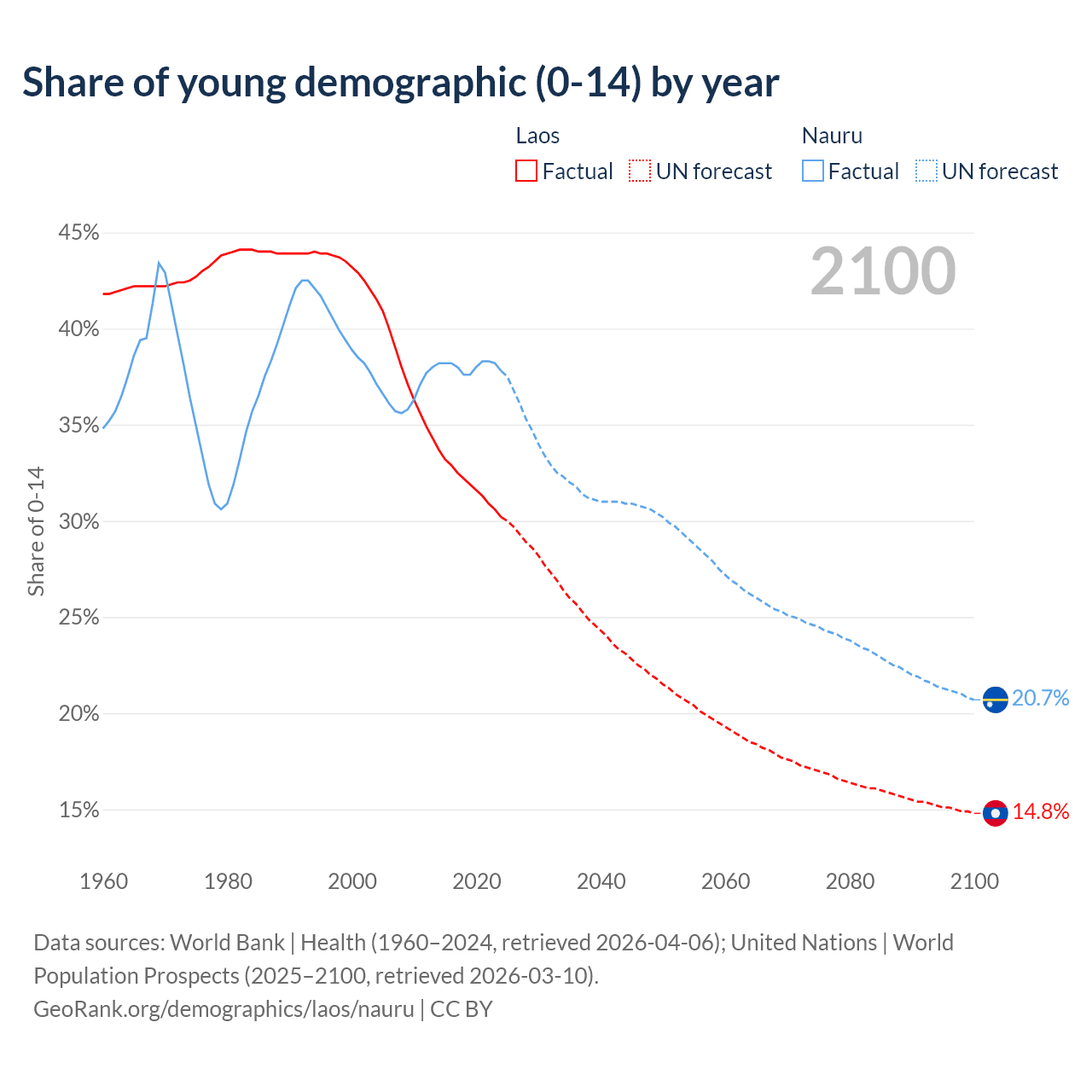 Median age Laos vs Nauru, 1960-2100