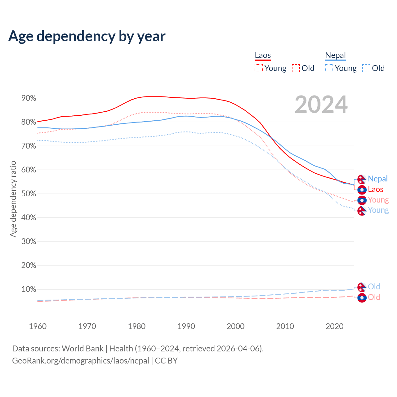 Data sources: World Bank | Health (1960–2024, retrieved 2026-04-06); U.S. Census Bureau (1960–2024, retrieved 2026-02-08).