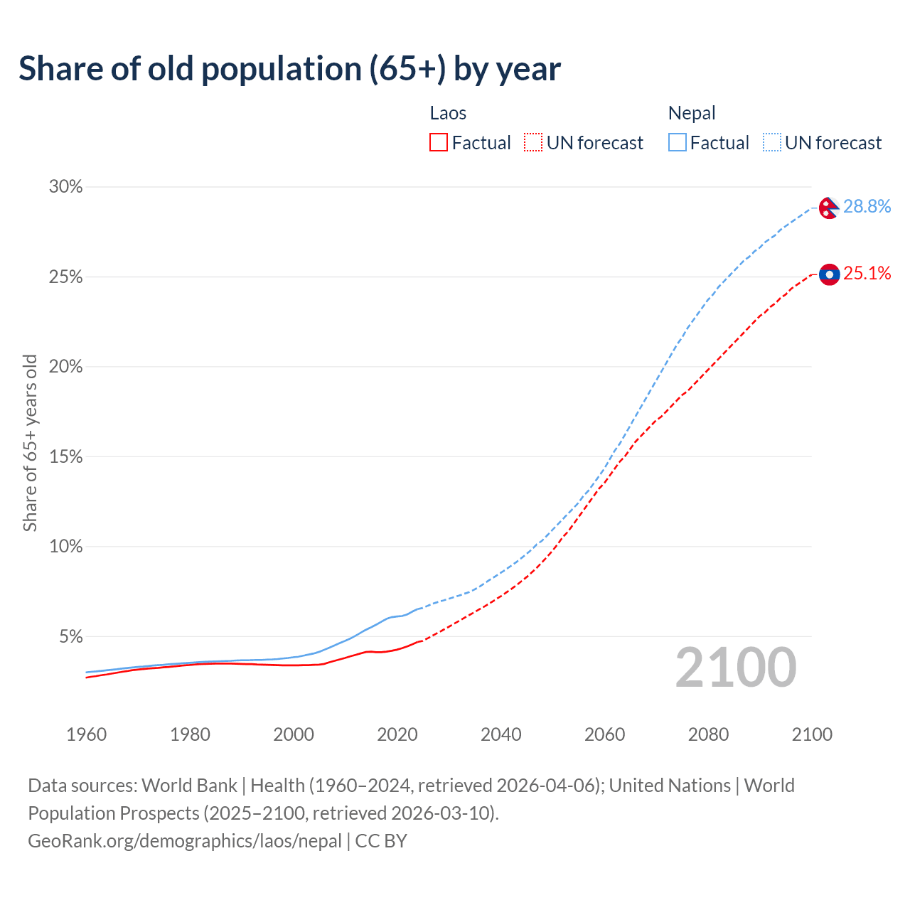 The share of older people aged 65 and over is 4.67% in Laos and 6.5% in Nepal. Life expectancy in Laos compared to Nepal .