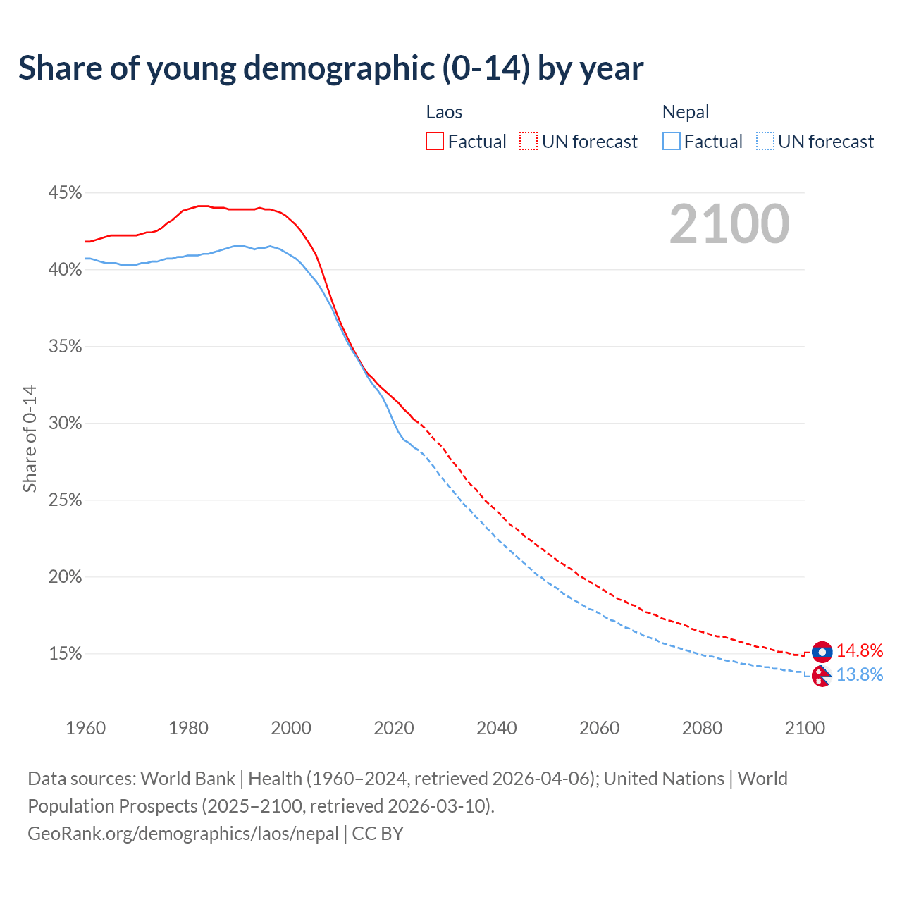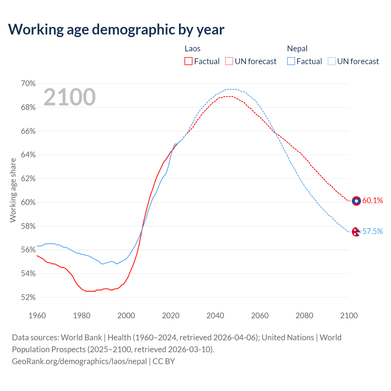 Median age Laos vs Nepal, 1960-2100