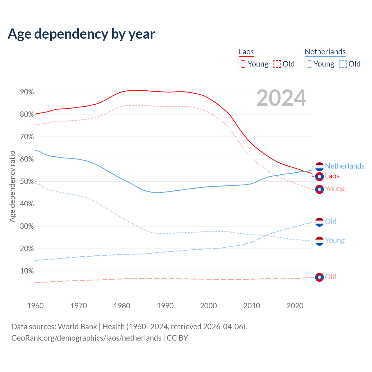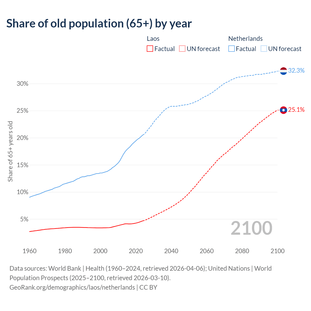 - The share of old-age demographic (65+) in Laos is 4.67% vs 20.5% in the Netherlands.