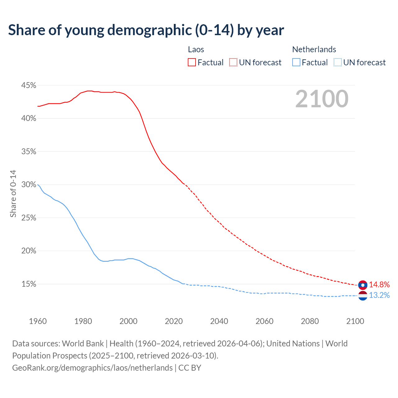 - The share of young demographic (0-15 years old) in Laos is 30.2% vs 15% in the Netherlands.