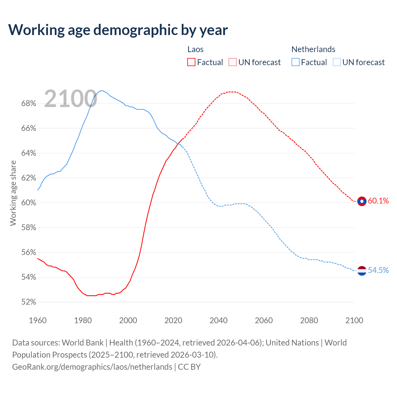 - Laos has 5.21M working age adults (aged 15-64) vs 11.8M in the Netherlands.