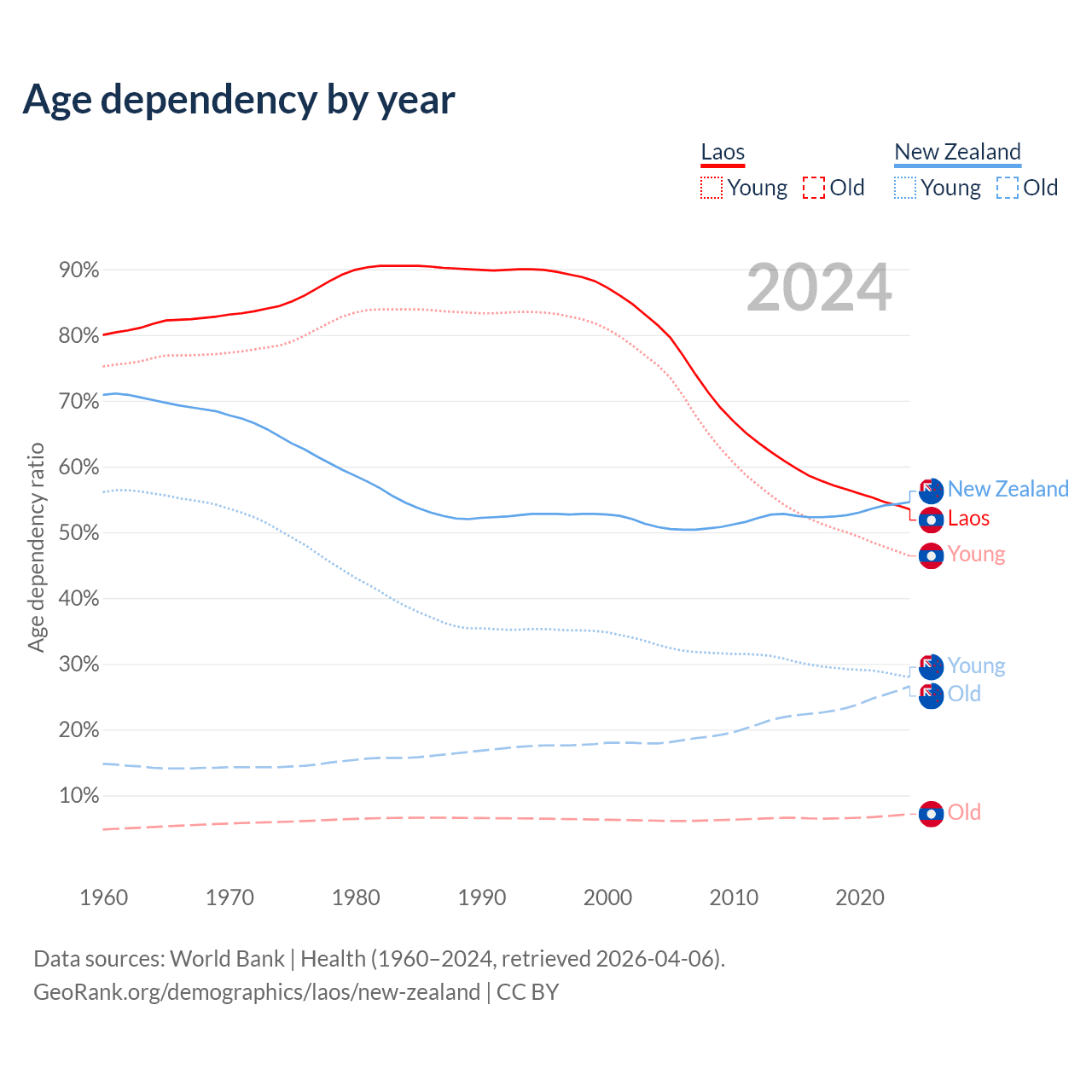- Laos is ranked 130/196 by median age (oldest to youngest) vs 56/196 for New Zealand.